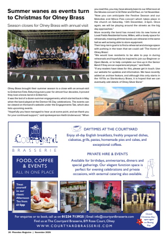 20 Phonebox Magazine | November 2025Season closes for Olney Brass with annual visitSummer wanes as events turn to Christmas for Olney BrassOlney Brass brought their summer season to a close with an annual visit to Emberton Fete. Returning every year for almost four decades, it proved they love a brass band in Emberton. It was the last of a dozen summer engagements, which started back in May when the band played at the Denton VE Day celebrations. The events can be viewed on the band%u2019s website under the Engagements Tab, which also lists upcoming events. %u201cHopefully you have managed to hear us at some point, and we thank you for your continued support,%u201d said spokesperson Keith Underwood. %u201cWhen you read this, you may have already been to our Afternoon at the Movies concert in St Peter and St Paul, on 1st November. %u201cNow you can anticipate the Festive Season and our Melodies and Mince Pies concert which takes place in the church on Saturday, 13th December, 3-5pm. Once again, we will be playing around the streets as the big day approaches.%u201dMore recently the band has moved into its new home at Lovat Fields Residential home, Willen, with a lovely space for rehearsals, meaning all three bands can rehearse in the same hall as well as being able to store equipment.Their long-term goal is to fi nd a rehearsal and storage space with parking in the town that we could call %u2018The Home of Olney Brass%u2019.%u201cWe would love residents to be able to pop in during rehearsals and hopefully be inspired to join our Beginner or Open Bands, or to help complete our line-up in the Senior Band if they are an experienced player,%u201d said Keith.%u201cIf any readers have ideas for this, please get in touch. Use our website for updates and information. We have recently added an archive feature, and although this only starts in the 1970s as Stantonbury Brass, it is hoped that we can eventually add details of Olney Silver Band.%u201dBRASSERIEFor enquiries or to book, call us on 01234 713925 | Email: info@courtyardbrasserie.comFind us at The Courtyard Brasserie, 8/9 Rose Court, Olney WWW.COURTYARDBRASSERIE.COM DAYTIMES AT THE COURTYARDEnjoy all-day English breakfasts, freshly prepared dishes, ciabattas, grills, pastas, homemade pies and cakes, and exceptional coffees.PRIVATE HIRE & EVENTSAvailable for birthdays, anniversaries, dinners and special gatherings. Our elegant function space is perfect for evening celebrations and private occasions, with external catering also available.Closed Christmas Day %u2013 open again on Boxing DayFOOD, COFFEE & EVENTSALL IN ONE PLACETreat yourself to our classicAfternoon Tea from %u00a315pp