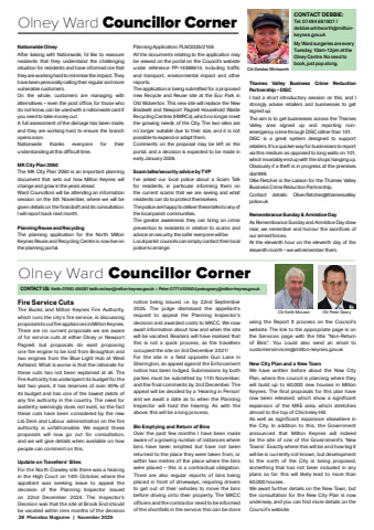 28 Phonebox Magazine | November 2025Fire Service CutsThe Bucks and Milton Keynes Fire Authority, which runs the city%u2019s fi re service, is discussing proposals to cut fi re appliances in Milton Keynes. There are no current proposals we are aware of for service cuts at either Olney or Newport Pagnell, but proposals do exist proposing one fi re engine to be lost from Broughton and two engines from the Blue Light Hub at West Ashland. What is worse is that the rationale for these cuts has not been explained at all. The Fire Authority has underspent its budget for the last two years, it has reserves of over 40% of its budget and has one of the lowest debts of any fi re authority in the country. The need for austerity seemingly does not exist, so the fact these cuts have been considered by the new Lib Dem and Labour administration on the fi re authority is unfathomable. We expect these proposals will now go out for consultation, and we will give details when available on how people can comment on this.Update on Travellers%u2019 SitesFor the North Crawley site there was a hearing in the High Court on 14th October, where the appellant was seeking leave to appeal the decision of the Planning Inspector issued on 22nd December 2024. The Inspector%u2019s Decision was that the site at Brook End should be vacated within nine months of the decision notice being issued, i.e. by 22nd September 2025. The judge dismissed the appellant%u2019s request to appeal the Planning Inspector%u2019s decision and awarded costs to MKCC. We now await information about how and when the site will be vacated. Readers will have realised that this is not a quick process, as the travellers occupied the site on 3rd December 2021!For the site in a fi eld opposite Gun Lane in Sherington, an appeal against the Enforcement notice has been lodged. Submissions by both parties must be submitted by 11th November, and the fi nal comments by 2nd December. The appeal will be decided by a %u2018Hearing in Person%u2019 and we await a date as to when the Planning Inspector will hold the hearing. As with the above, this will be a long process.Bin Emptying and Return of BinsOver the past few months I have been made aware of a growing number of instances where bins have been emptied but have not been returned to the place they were taken from, or within two metres of the place where the bins were placed %u2013 this is a contractual obligation. There are also regular reports of bins being placed in front of driveways, requiring drivers to get out of their vehicles to move the bins before driving onto their property. The MKCC offi cers and the contractor need to be informed of the shortfalls in the service; this can be done using the Report It process on the Council%u2019s website. The link to the appropriate page is on the Services page with the title %u201cNon-Return of Bins%u201d. You could also send an email to customerservices@milton-keynes.gov.uk New City Plan and a New TownWe have written before about the New City Plan, where the council is planning where they will build up to 60,000 new houses in Milton Keynes. The fi nal proposals for this plan have now been released, which show a signifi cant expansion of the MKE area, which stretches almost to the top of Chicheley Hill. As well as signifi cant expansion elsewhere in the City. In addition to this, the Government announced that Milton Keynes will indeed be the site of one of the Government%u2019s %u2018New Towns%u2019. Exactly where this will be and how big it will be is currently not known, but development to the north of the City is being proposed, something that has not been included in any plans so far; this will likely lead to more than 60,000 houses. We await further details on the New Town, but the consultation for the New City Plan is now underway, and you can fi nd more details on the Council%u2019s website.Olney Ward Councillor Corner CONTACT DEBBIE:Tel: 07494 681907 / debbie.whitworth@miltonkeynes.gov.ukMy Ward surgeries are every Tuesday, 10am-12pm at the Olney Centre. No need to book, just pop along.Cllr Debbie WhitworthOlney Ward Councillor CornerCllr Keith McLean Cllr Peter GearyCONTACT US: Keith: 07983 456081 keith.mclean@milton-keynes.gov.uk :: Peter: 07774 939404 peter.geary@milton-keynes.gov.ukNationwide Olney After liaising with Nationwide, I%u2019d like to reassure residents that they understand the challenging situation for residents and have informed me that they are working hard to minimise the impact. They have been personally calling their regular and more vulnerable customers.On the whole, customers are managing with alternatives %u2013 even the post offi ce, for those who do not know, can be used with a nationwide card if you need to take money out.A full assessment of the damage has been made, and they are working hard to ensure the branch opens soon.Nationwide thanks everyone for their understanding at this diffi cult time.MK City Plan 2050The MK City Plan 2050 is an important planning document that sets out how Milton Keynes will change and grow in the years ahead.Ward Councillors will be attending an information session on the 5th November, where we will be given details on the fi nal draft and its consultation. I will report back next month.Planning Reuse and RecyclingThe planning application for the North Milton Keynes Reuse and Recycling Centre is now live on the planning portal.Planning Application: PLN/2025/2159. All the documents relating to the application may be viewed on the portal on the Council%u2019s website under reference PP-14369614, including traffi c and transport, environmental impact and other reports. The application is being submitted for a proposed new Recycle and Reuse site at the Eco Park in Old Wolverton. This new site will replace the New Bradwell and Newport Pagnell Household Waste Recycling Centres (HWRCs), which no longer meet the growing needs of the City. The two sites are no longer suitable due to their size, and it is n