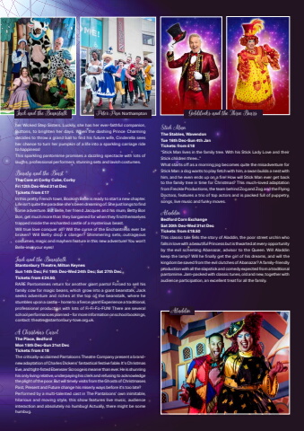 November 2025 | Phonebox Magazine 31her Wicked Step Sisters. Luckily, she has her ever-faithful companion, Buttons, to brighten her days. When the dashing Prince Charming decides to throw a grand ball to fi nd his future wife, Cinderella sees her chance to turn her pumpkin of a life into a sparkling carriage ride to happiness! This sparkling pantomime promises a dazzling spectacle with lots of laughs, professional performers, stunning sets and lavish costumes.Beauty and the Beast The Core at Corby Cube, CorbyFri 12th Dec-Wed 31st DecTickets: from %u00a317In this pretty French town, Bookish Belle is ready to start a new chapter. Life isn%u2019t quite the paradise she%u2019s been dreaming of. She just longs to fi nd some adventure. But Belle, her friend Jacques and his mum, Betty Bon Bon, get much more than they bargained for when they fi nd themselves trapped inside the enchanted castle of a mysterious beast.Will true love conquer all? Will the curse of the Enchantress ever be broken? Will Betty drop a clanger? Shimmering sets, outrageous costumes, magic and mayhem feature in this new adventure! You won%u2019t Belle-ieve your eyes!Jack and the BeanstalkStantonbury Theatre, Milton KeynesSun 14th Dec; Fri 19th Dec-Wed 24th Dec; Sat 27th DecTickets: from %u00a324.50RARE Pantomimes return for another giant panto! Forced to sell his family cow for magic beans, which grow into a giant beanstalk, Jack seeks adventure and riches at the top of the beanstalk, where he stumbles upon a castle %u2013 home to a fi erce giant! Experience a traditional, professional production with lots of Fi-Fi-Fo-FUN! There are several school performances planned %u2013 for more information on school bookings, contact: theatre@stantonbury-tove.org.uk. A Christmas CarolThe Place, BedfordMon 15th Dec-Sun 21st DecTickets: from %u00a318The critically-acclaimed Pantaloons Theatre Company present a brandnew adaptation of Charles Dickens%u2019 fantastical festive fable. It%u2019s Christmas Eve, and tight-fi sted Ebenezer Scrooge is meaner than ever. He is shunning his only living relative, underpaying his clerk and refusing to acknowledge the plight of the poor. But will timely visits from the Ghosts of Christmases Past, Present and Future change his miserly ways before it%u2019s too late?Performed by a multi-talented cast in The Pantaloons%u2019 own inimitable, hilarious and moving style, this show features live music, audience interaction and absolutely no humbug! Actually, there might be some humbug.Stick ManThe Stables, WavendonTue 16th Dec-Sun 4th JanTickets: from %u00a318%u201cStick Man lives in the family tree. With his Stick Lady Love and their Stick children three...%u201dWhat starts off as a morning jog becomes quite the misadventure for Stick Man: a dog wants to play fetch with him, a swan builds a nest with him, and he even ends up on a fi re! How will Stick Man ever get back to the family tree in time for Christmas? This much-loved adaptation from Freckle Productions, the team behind Zog and Zog and the Flying Doctors, features a trio of top actors and is packed full of puppetry, songs, live music and funky moves.AladdinBedford Corn ExchangeSat 20th Dec-Wed 31st DecTickets: from %u00a318.50This classic tale tells the story of Aladdin, the poor street urchin who falls in love with a beautiful Princess but is thwarted at every opportunity by the evil scheming Abanazar, advisor to the Queen. Will Aladdin keep the lamp? Will he fi nally get the girl of his dreams, and will the kingdom be saved from the evil clutches of Abanazar? A family-friendly production with all the slapstick and comedy expected from a traditional pantomime. Jam-packed with classic tunes, old and new, together with audience participation, an excellent treat for all the family.Jack and the Beanstalk Peter Pan Northampton Goldilocks and the Three BearsAladdin