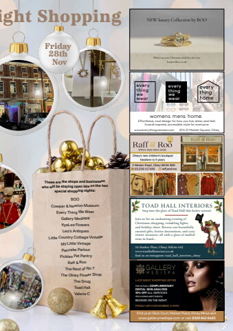 November 2025 | Phonebox Magazine 33Step into the glow of Toad Hall this festive season!TOAD HALL INTERIORSJoin us for an enchanting evening of Christmas shopping, twinkling lights, and holiday cheer. Browse our beautifully curated gifts, festive decorations, and cozy winter treasures, all with a glass of mulled wine in hand...34 Market Place, Olney MK46 4AJwww.toadhallinteriors.co.uk fi nd us on instagram: toad_hall_interiors_olneywww.gallerymedispa.com or call 0330 043 0403Find us at 1 Bull Court, Market Place, Olney, MK46 4EALATE NIGHT SHOPPING OFFERPOP IN FOR A COMPLIMENTARY DIGITAL SKIN ANALYSIS15% OFF ALL SERVICES (EXCLUDING INJECTABLES) BOOKED ON THE NIGHTFRIDAY 28TH NOVEMBER, 5-8PMweareverythingweweareverythingwewomens. mens. home.Effortlessly cool design for how you live, dress and feel.Scandi-inspired, accessible style for everyone.www.everythingwewear.com 20A-21 Market Square, OlneyNEW luxury Collection by BOOWhat%u2019s on your Christmas wish list this yearboojewellery.co.ukThese are the shops and businesses who will be staying open late on the two special shopping nights:BOOCowper & Newton MuseumEvery Thing We WearGallery MedispaKyeLee FlowersLeo%u2019s AntiquesLittle Country Cottage VintageMy Little VintagePancake ParlourPickles Pet PantryRaff & RooThe Nest at No 7The Olney Flower ShopThe SnugToad HallValeria Cight ShoppingFriday28thNov