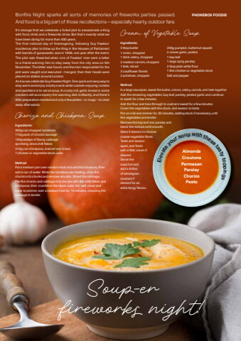34 Phonebox Magazine | November 2025Bonfire Night sparks all sorts of memories of fireworks parties passed. And food is a big part of those recollections %u2013 especially hearty, outdoor fare.It%u2019s strange that we celebrate a foiled plot to assassinate a King with food, drink and a fi reworks show. But that%u2019s exactly what we have been doing for more than 400 years. The first national day of thanksgiving, following Guy Fawkes%u2019 murderous plan to blow up the King in the Houses of Parliament with barrels of gunpowder, was in 1606, one year after the event.The plot was thwarted when one of Fawkes%u2019 men sent a letter to a friend warning him to stay away from the city area on 5th November. The letter was found, and the men responsible for the plot were caught and executed %u2013 hanged, then their heads were placed on stakes around London.And so we celebrate Guy Fawkes Night. One quick and easy way to stay warm and enjoy a tasty snack while outside enjoying rockets and sparklers is to serve soup. A crusty roll, garlic bread or some crackers will accompany the warming dish brilliantly, and there%u2019s little preparation needed and only a few plates %u2013 or mugs %u2013 to clear away afterwards.Chorizo and Chickpea SoupIngredients:400g can chopped tomatoes110g pack of chorizo sausage140g wedge of Savoy cabbagesprinkling dried chilli fl akes410g can chickpeas, drained and rinsed1 chicken or vegetable stock cubeMethod:Put a medium pan over medium heat and add the tomatoes, then add a can of water. While the tomatoes are heating, chop the chorizo into chunks and remove any skin. Shred the cabbage.Pile the chorizo and cabbage into the pan with the chilli fl akes and chickpeas, then crumble in the stock cube. Stir well, cover and leave to simmer over a medium heat for 10 minutes, checking the cabbage is tender.Cream of Vegetable SoupIngredients:3 tbsp butter1 onion, chopped1 stick celery, chopped2 medium carrots, chopped1 leek, sliced3 caulifl ower fl orets2 potatoes, choppedMethod:In a large saucepan, sweat the butter, onions, celery, carrots, and leek togetherAdd the remaining vegetables, bay leaf, parsley, peeled garlic and continue to saut%u00e9 for a few minutes.Add the fl our and toss through to coat and sweat for a few minutesCover the vegetables with the stock, and season to taste.Put on a lid and simmer for 30 minutes, adding stock if necessary, until the vegetables are tender.Remove the bay leaf and parsley and blend the mixture until smooth. Sieve if desired to remove coarse vegetable fi bres.Taste and season again, and fi nish with a little cream if desired.Serve the soup hot and add a dollop of wholegrain mustard if desired for an extra tangy fl avour.Soup-er fireworks night!200g pumpkin, butternut squash2 cloves garlic, peeled1 bay leaf1 large sprig parsley2 tbsp plain white fl our1 litre chicken or vegetable stockSalt and pepperElevate your soup with these tasty toppni gsAlmondsCroutonsParmesanParsleyChorizoPestoPHONEBOX FOODIE
