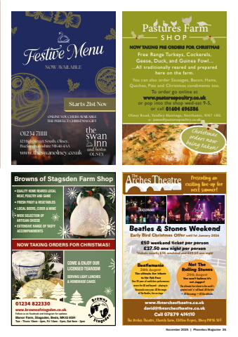 November 2025 | Phonebox Magazine 3501234 822330Browns of Stagsden Farm ShopCOME & ENJOY OUR LICENSED TEAROOMSERVING LIGHT LUNCHES & HOMEMADE CAKES%u2022 QUALITY HOME REARED LOCAL MEAT, POULTRY AND GAME%u2022 FRESH FRUIT & VEGETABLES %u2022 LOCAL BEERS, CIDER & WINE %u2022 WIDE SELECTION OF ARTISAN CHEESE%u2022 EXTENSIVE RANGE OF TASTY ACCOMPANIMENTS NOW TAKING ORDERS FOR CHRISTMAS!www.brownsofstagsden.co.ukFollow us on Facebook and Instagram for updatesManor Farm, Stagsden, Beds, MK43 8SHTue - Thurs 10am - 4pm, Fri 10am - 5pm, Sat 9am - 3pm01234 711111www.theswanolney.co.ukNOW AVAILABLEStarts 21st Nov12 High Street South, Olney,Buckinghamshire MK46 4AAONLINE VOUCHERS AVAILABLETHE PERFECT CHRISTMAS GIFTPastures FarmSHOPNOW TAKING PRE ORDERS FOR CHRISTMASFree Range Turkeys, Cockerels, Geese, Duck, and Guinea Fowl......All traditionally reared and prepared here on the farm.You can also order Sausages, Bacon, Hams, Quiches, Pies and Christmas condiments too.To order go online atwww.pasturespoultry.co.ukor pop into the shop wed-sat 9-5, or call 01604 696586Christmas orders now being taken!Olney Road, Yardley Hastings, Nor thants, NN7 1HLe: james@pasturespoultry.co.ukPresenting an exciting line-up for next su er! www.thearchestheatre.co.uk david@thearchestheatre.co.ukCall 07879 414%u008f 0 The Arches Theatre, Church Farm, Clifton Reynes, Olney MK46 5DTNot The Rolling Stones29th AugustYou won%u2019t believe it%u2019s not Jagger!The ultimate live tribute to the world%u02bcs greatest rock %u02bcn%u02bc roll band. All the hits %u2022 All the energy %u2022 All the attitude.Beatlemania28th AugustThe ultimate live tribute to the Fab FourOver 20 years of world-class performances across the UK and beyond %u2013 playing to thousands every year. All the magic of The Beatles, live on stageBeatles & Stones WeekendEarly Bird Christmas Offer until 1st January 2026%u00a350 weekend ticket per person%u00a327.50 one night per person*tickets usually %u00a3%u00b4 weekend and %u00a329.50 one night