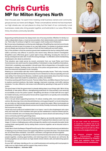 36 Phonebox Magazine | November 2025Over the past year, I%u2019ve spent time meeting small business owners and community groups across our towns and villages. These conversations remind me how important our high streets are, not just places to shop, but the heart of our community. Local businesses create jobs, bring people together, and build pride in our area. When they thrive, the whole community benefi ts.Supporting small businesses has always been one of my top priorities. Whether it%u2019s family-run caf%u00e9s, independent shops, or local service providers, their determination and creativity inspire me. That%u2019s why I%u2019ll continue to fi ght for more support, both locally and in Parliament.But I know many shopkeepers are facing real challenges. Shoplifting has reached record levels nationally, and we%u2019ve seen it increase on our own high streets. I%u2019ve spoken to business owners who are deeply worried about the impact of theft on their livelihoods and staff safety.Part of the problem is that the previous government weakened the law by making theft under %u00a3200 a summary-only off ence. In practice, this meant many off ences weren%u2019t investigated. Shoplifters were eff ectively given a green light to keep off ending, knowing the chances of facing consequences were slim. It sent the wrong message %u2013 to off enders and to hardworking shopkeepers who deserve protection.That situation was made worse by recent comments from our local Police and Crime Commissioner, who said it was the responsibility of individuals to stop shoplifters themselves. I think that%u2019s completely unacceptable. It should never fall on shopworkers or the public to put themselves in danger. Tackling crime is the job of the police and government, and they must have the resources and powers to do it properly.Keeping our communities safe also means addressing everyday issues. That%u2019s why I recently attended the MK North East Rural Community Forum in Emberton to discuss speeding and rural road safety. From Astwood to Moulsoe, residents spoke passionately about how fast-moving traffi c makes roads feel unsafe for pedestrians, cyclists, and children.I%u2019ll continue working with Parish Councils, Thames Valley Police, and Milton Keynes City Council to explore practical solutions, like better signage, improved crossings, and traffi c-calming measures. I%u2019ve also off ered to visit areas most aff ected by speeding to help push for further action.The good news is that the government is already taking steps to put things right. We%u2019re hiring thousands of new police offi cers, strengthening protections for shop workers, and restoring accountability across the justice system. Shoplifting and abuse of retail staff will once again be treated seriously, and local police forces will be supported to act quickly and consistently when crimes are reported.This is not just about supporting business. It%u2019s about creating safer, more welcoming town centres. By reducing crime and antisocial behaviour, and supporting well-run local enterprises, we can make our high streets places people want to spend time again. When local people are empowered to shape their high streets, we see more family-friendly, community-focused spaces that everyone can enjoy.I know how much pride local residents take in our towns. I see it in the shopkeepers who open early and close late, in the volunteers who give up their weekends to improve shared spaces, and in the residents who care deeply about keeping our towns vibrant and welcoming. It%u2019s that same community spirit that gets things done.Working with local Councillors and the Environment Agency, we recently reported overgrown weeds along our rivers to help prevent fl ooding, and I%u2019m pleased that clearance work has now begun. It%u2019s been a challenging year, with prolonged dry weather and unusually low water levels causing faster weed growth, but by raising these concerns together, we%u2019ve ensured action is being taken.I%u2019d also like to thank the Newport Pagnell Flood Group for their continued hard work and dedication in keeping on top of these issues and supporting eff orts to protect the town. This shows what we can achieve when residents, councillors, volunteers, and agencies all work together.Ultimately, revitalising our high streets is about more than bricks and mortar. It%u2019s about bringing people together, creating opportunities, and restoring pride in the places we call home. By working together, we can ensure our high streets remain vibrant, safe, and welcoming spaces for everyone.As your MP, I will keep standing up for our small businesses and working with local people to make sure our high streets get the support they need to thrive.Chris CurtisMP for Milton Keynes NorthAs a l w ay s , p l e a se fo l l ow m y F a c e b o o k p a g e (@ChrisCurtisLabour) for frequent news and updates from both Westminster and our constituency. If you ever need my assistance, or would like to attend one of my constituency surgeries, please don%u2019t hesitate to get in touch with my offi ce via chris.curtis.mp@parliament.uk