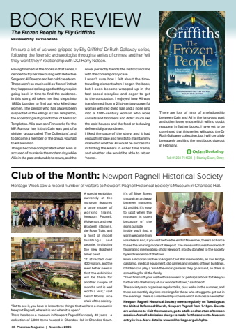 38 Phonebox Magazine | November 2025Having fi nished all the books in that series, I decided to try her new outing with Detective Sergeant Ali Dawson and her cold case team. These aren%u2019t so much cold as %u2018frozen%u2019 in that they happened so long ago that they require going back in time to find the evidence. In this story, Ali takes her fi rst steps into 1850s London to fi nd out who killed two women. The person who has always been suspected of the killings is Cain Templeton, the eccentric great-grandfather of MP Isaac Templeton. Ali%u2019s own son Finn works for the MP. Rumour has it that Cain was part of a sinister group called %u2018The Collectors%u2019, and to become a member of the group, you had to kill a woman. Things become complicated when Finn is accused of murder in the modern day, while Ali is in the past and unable to return, and the Reviewed by Jackie WildeThe Frozen People by Elly Griffi thsI%u2019m sure a lot of us were gripped by Elly Griffi ths%u2019 Dr Ruth Galloway series, following the forensic archaeologist through a series of crimes, and her %u2018will they-won%u2019t they?%u2019 relationship with DCI Harry Nelson. novel perfectly blends the historical crime with the contemporary case.%u00a0I wasn%u2019t sure how I felt about the timetravelling element when I began the book, but I soon became wrapped up in the fast-paced storyline and eager to get to the conclusion. I enjoyed how Ali was transformed from a 21st-century powerful woman with red dyed hair and a nose ring into a 19th-century woman who wore corsets and bloomers and didn%u2019t much like the cold houses and the food or behaving deferentially around men.%u00a0I liked the pace of the story, and it had enough intrigue and twists to maintain my interest in whether Ali would be successful in finding the killers in either time frame, and whether she would be able to return %u2018home%u2019.%u00a0 BookshopTel: 01234 714592 | Stanley Court, OlneyBOOK REVIEWThere are lots of hints of a relationship between Cain and Ali in the long-ago past and other loose ends which will no doubt reappear in further books. I have yet to be convinced that this series will outdo the Dr Ruth Galloway collection, but I will certainly be eagerly awaiting the next book, due out in February.Club of the Month: Newport Pagnell Historical SocietyHeritage Week saw a record number of visitors to Newport Pagnell Historical Society%u2019s Museum in Chandos Hall. A special exhibition currently at the museum features a large model of wo r k i n g t ra i n s , Newport Pagnell, Wolverton, and new Bradwell stations, the Royal Train, and a host of model b u i l d i n g s a n d people, including the new Bradwell Silver band.%u201cIt attracted over 400 visitors, and the even better news is that the exhibition will be there for another couple of months and is well worth a visit,%u201d said Geoff Morris, vice chair of the society.%u201cBut to see it, you have to know three things: that we have a museum in Newport Pagnell, where it is and when it is open.%u201dThere has been a museum in Newport Pagnell for nearly 40 years %u2013 a collection of 5,000 items housed in Chandos Hall in Chandos Court. It%u2019s off Silver Street through an archway between numbers 52 and 54. It%u2019s easy to spot when the museum is open because of the signs outside.Inside you%u2019ll find, a warm welcome from volunteers. And, if you visit before the end of November, there%u2019s a chance to see the amazing model of Newport. The museum houses hundreds of fascinating memorabilia of old Newport, mostly donated to the society by kind residents of the town.From a Victorian kitchen to English Civil War memorabilia, an Iron Bridge gas lamp, medical equipment, old games and models of town buildings. Children can play a %u2018Find-the-mice%u2019 game as they go around, so there is something for all the family. %u201cThen fi nish off your visit with a souvenir or perhaps a book to take you further into the history of our wonderful town,%u201d said Geoff .The society also organises regular talks, plus walks in the summer, and there are monthly daytime meetings for those who struggle to get out in the evenings. There is a membership scheme which includes a newsletter.Newport Pagnell Historical Society meets regularly on Tuesdays at the United Reformed Church, Newport Pagnell from 7.15pm. Guests are welcome to visit the museum, go to a talk or chat at an afternoon session. A small admission charge is made for these events. Museum entry is free. More details: www.mkheritage.org.uk/nphs.