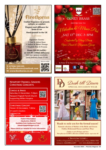 November 2025 | Phonebox Magazine 39OLNEY BRASSMelodies & Mince PiesINVITES YOU TOSAT 13th DEC 3-5PMWWW.OLNEYBRASS.CO.UKTICKETS AVAILABLEONLINE OR ON THEDOORRaffle&RefreshmentsSt Peter & St Paul Church, Olney, MK46 4ADADULTS %u00a310 ~ UNDER 18s FREETICKETS HERESupported by Olney BrassOpen Band & Beginners Groupx 132mm) Newport Pagnell SingersChristmas ConcertsChristmas ConcertFriday 19 December, 7.00pmSt Laud%u2019s ChurchSheringtonTicket informationAdults %u00a312; Child %u00a35Available from Cambourne Travelnewportpagnellsingers.co.ukPlease check our website for more information.Carols & BrassSaturday 13 December, 7.30pmNewport Pagnell Parish ChurchSupporting Willen HospiceReady to style you for the formal season!Fantastic selection of Mother of the Bride and Groom Outfits, Bridesmaid Dresses and Party WearOutfits to suit all shapes and sizesNew plus size CURVE collection available instore - up to size 30 Dusk till DawnSPECIAL OCCASION WEARDD%u2022 Tel: 01234 712200 %u20221st Floor Dagnall House, Stanley Court, Olney, MK46 5NH instagram: dusktilldawn007 visit: www.dusktdawn.co.ukCrafted fragrance to ground, refresh, or comfortElegant reed diffusers for home & carHand-poured in the UKScan to orderT: 07596 553135E: thefi rethorns@outlook.comW: www.fi rethorns.co.ukSignature Scents:%u2022 Oud & Velvet Rose%u2022 Amber & Sweet Orange%u2022 English Pear & FreesiaFrom %u00a320.90 (refi lls)or %u00a324.80 (100ml diffusers)Gift box options availableLocal delivery from %u00a33.00