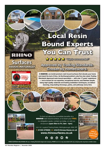 42 Phonebox Magazine | November 2025RHINO SURFACE SOLUTIONS LTD are a Trading Standards Approved company. RHINO are in no way associated with any company who may have a similar name.To find out about the incredible benefits of a Rhino resin bound surface, or to book your FREE, no obligation quote, contact us today, or visit our showroom (open Mon to Fri, 9am - 4pm).Unit 141, Leyland Trading Estate, Wellingborough, NN8 1RT T: 01933 276998 | E: info@rhinosurfaces.co.uk www.rhinosurfaces.co.ukRated 5/5www.buywithconfidence.gov.ukBeforeAfterLocal Resin Bound Experts You Can Trust%u201cHighly recommended!%u201dApproved by Trading Standards. Chosen by Homeowners.At Rhino, we install premium resin bound surfaces that elevate your home and stand the test of time. As Northamptonshire%u2019s only five-star-rated, Trading Standards Approved resin bound specialists %u2014 with over 17 years%u2019 experience %u2014 we%u2019re known for our expertise, exceptional service, and flawless results. Using high-quality materials and leading installation techniques, we deliver stunning, long-lasting driveways, patios, and pathways every time.Visit us at our large showroom!