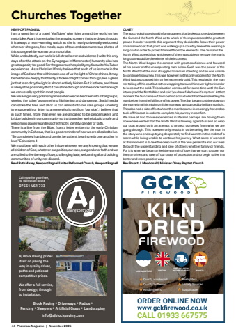 44 Phonebox Magazine | November 2025CALL 01933 667575FREE DELIVERYWITHIN 15 MILES WS6074 READY TO BURNLOW MOISTURE BRITISHORDER ONLINE NOWFIREWOODKILN DRIED Quality Hardwood Quality Softwood Kindling Nets Hardwood & Softwood Nets. Firelighters Locally Sourced SustainableQuality Hardwood Quality Softwood Kindling Nets Firelighters Locally sourced Sustainable Firelighters Locally sourced SustainableNEWPORT PAGNELLI am a great fan of a travel %u2018YouTuber%u2019 who rides around the world on her motorbike. Apart from enjoying the amazing scenery that she drives through, it is always a heart-warming watch as she is nearly universally welcomed wherever she goes, free meals, cups of teas and also numerous photos of this strange white woman on a motorbike.While, undoubtedly, our world is full of real horror and violence (I write this only days after the attack on the Synagogue in Manchester) humanity also has great capacity for good. For the generous hospitality my favourite YouTuber experiences. As a Christian I fi rmly believe that each of us is made in the image of God and that within each one of us the light of Christ shines. It may be hidden so deeply that hardly a fl icker of light comes through, like a glass jar that is so dirty the light is almost entirely hidden. But it is there, and there is always the possibility that it can shine through and if we look hard enough we can usually spot it in most people. We are living in very polarising times when we can be drawn into tribal groups, viewing the %u2018other%u2019 as something frightening and dangerous. Social media can stoke the fi res and all of us can retreat into our safe groups unwilling to engage with or listen to anyone who is not from %u2018our side%u2019. I believe that in such times, more than ever, we are all called to be peacemakers and bridge builders in our community so that together we help build a safe and welcoming place regardless of ethnicity, identity, gender or faith. There is a line from the Bible, from a letter written to the early Christian community in Ephesus, that is a good reminder of how we are all called to live. %u201cBe completely humble and gentle; be patient, bearing with one another in love.%u201d Ephesians 4We must bear with each other in love whoever we are, knowing that we are all children of God, whatever our politics, our race, our gender or faith and we are called to live the way of love, challenging hate, welcoming all and building communities of unity, not discord.Revd Ruth Maxey, Newport Pagnell United Reformed Church, Newport PagnellChurches TogetherOLNEYThe apocryphal story is told of an argument that broke out one day between the Sun and the North Wind as to which of them possessed the greatest power. In order to settle this argument they decided to focus their power on a man who at that point was walking up a country lane while wearing a long coat in order to protect himself from the elements. The Sun and the North Wind agreed that whichever of them was able to remove the man%u2019s long coat would be the winner of their contest.The North Wind began the contest with great confi dence and focused all his power on the unsuspecting man below. Such was the power of the North Wind that the man struggled to remain standing and so was unable to continue his journey. This was however not his only problem for the North Wind had also caused him to feel extremely cold. This resulted in the man not taking off his coat but rather wrapping it around him ever tighter in order to keep out the cold. This situation continued for some time until the Sun interrupted the North Wind and said %u2018you have failed now it%u2019s my turn%u2019. At that moment the Sun came out from behind a cloud which had been shielding the man below from the full force of his power. The Sun began to shine down on the man with all his might until the man was surrounded by brilliant sunlight. This also had a side eff ect where the man became increasingly hot and so took off his coat in order to complete his journey in comfort. We have all had those experiences in life and perhaps are having them now where we feel that the North Wind is blowing against us and so wrap our coat around us in an attempt to protect ourselves from what we are going through. This however only results in us behaving like the man in the story who ends up trying desperately to fi nd warmth in the midst of a storm while being unable to continue his journey. What some of us need at this moment is to feel the deep heat of the Sun penetrate into our lives through the understanding and love of others whether family or friends. For it is when we begin to feel the warmth of love that we start to open our lives to others and take off our coats of protection and so begin to live in a better and more positive way. Rev Stuart J. Macdonald, Minister Olney Baptist Church. Block Paving %u2022 Driveways %u2022 Patios %u2022 Fencing %u2022 Sleepers %u2022 Artificial Grass %u2022 Landscapinginfo@ajblockpaving.comAJ Block Paving pridesitself on paving theway in quality drives,paths and patios atcompetitive prices.We offer a full service,from design, throughto installation.07551 461 733Call now for your free,no obligation quote