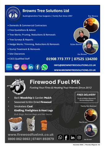 November 2025 | Phonebox Magazine 45Firewood Fuel MKFueling Your Fires & Heating Your Homes Since 2012%u2022 Bark Woodchip & Garden Mulch%u2022 Seasoned & Kiln Dried Firewood%u2022 Smokeless Coal%u2022 Kindling, Firelighters & Heat LogsRay Brown0800 862 0863 | 07401 893979www.firewoodfuelmk.co.ukBulk Bags, Barrow Bags and Net Sacks %u2018Family Run Business%u2019Jaz BrownRay BrownJaz BrownFREE DELIVERYTo all of Milton Keynes &Surrounding AreasBrowns Tree Solutions Ltd%u2022 Domestic & Commercial Contractors%u2022 Free Quotations & Advice %u2022 Tree Works: Pruning, Reductions & Removals %u2022 Tree Surveys & Reports %u2022 Hedge Works: Trimming, Reductions & Removals %u2022 Stump Treatment & Removals %u2022 Site Clearances%u2022 CSCS Qualified StaffBuckinghamshire Tree Surgeons | Family Run Since 1997INFO@BROWNSTREESOLUTIONS.CO.UKWWW.BROWNSTREESOLUTIONS.CO.UK01908 773 777 | 07525 134200Jaz BrownDylan BrownRay Brown