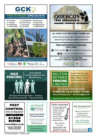 46 Phonebox Magazine | November 2025CALL US FOR A FREE QUOTATION 01908 616 112 or 01234 713 843 www.mk-fencing.co.uk %u2022 mk1fencing@aol.comMILTONKEYNESFENCINGLIMITEDOsbournes Farm, Newport Road, Emberton, MK46 5JDFor All Your Fencing, Decking and Sheds in Olney, Milton Keynes & Surrounding Areas A small family run business with over 25 years experienceAll Types of Fencing & Gates %u2022 DeckingPatios & Groundworks %u2022 Stump GrindingMAXFENCING07791 369709maxfencing@yahoo.com MaxFencing%u2022 Pruning, Hedgecutting, Leylandii reduction%u2022 Turfi ng & Planting%u2022 Patio Cleaning & Restoration%u2022 Fencing, Trellising & Fence repair%u2022 Bespoke log storesTaylor LandscapesPlease call Justin for a quote07816 097 79701234 714 634Leylandii reduction%u2022 Turfi ng & Planting%u2022 Fencing, Trellising Offering all aspects of landscaping from maintenance to complete re-landscapingOffice: 01234 240430 Mobile: 07515 632666sjr@richardsonlandscapes.comPESTCONTROL %u201cAnts to Elephants%u201dRENTAKEEPER01 90 8510189www.killem.co.ukLocal, ReliableFully InsuredTree Surgery SpecialistsWe provide professional tree care, landscaping and fencing services, in accordance with the rigorous standards laid out by the Arboricultural Association.For more information call: 01933 667575Email: enquiries@gcktreeworks.co.ukFREEquotes%u2022 Tree Felling%u2022 Pollarding%u2022 Dead Wooding%u2022 Stump Grinding%u2022 Crown Reductions%u2022 Crown Thinning%u2022 Crown Lifting%u2022 Tree Surveys%u2022 Site Clearence%u2022 Hedge Cutting%u2022 Hedge Reductions%u2022 Hedge RemovalsGCK Domestic leaflet A5.indd 1 14/08/2018 10:42TREE SURGERY SPECIALISTS www.gcktreeworks.co.ukTree FellingPollardingDead WoodingStump GrindingCrown ReductionsCrown ThinningCrown LiftingTree SurveysSite ClearanceHedge CuttingHedge ReductionsHedge RemovalsCONTACT US NOW FOR YOUR FREE NO OBLIGATION QUOTEt: 01933 667575 | e: enquiries@gcktreeworks.co.ukFind out more: 01234 713 298 Unit 2, Stanley Court, Olney, Bucks, MK46 5NHLarge Format & Plan Printing AvailableEmail your fi les and printing requirements to Sarah:info@orchard.press