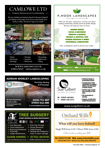 November 2025 | Phonebox Magazine 47TREE SURGERYSTUMP GRINDING & HEDGE MAINTENANCE01908 049955 %u2022 07731 467078www.monettreecare.co.uk %u2022 info@monettreecare.co.uk%u2022 Tree Removals%u2022 Crown Reductions%u2022 Removing Deadwood%u2022 Pollarding%u2022 Hedge Maintenance%u2022 Fruit Tree Pruning%u2022 Stump Removals%u2022 Cable Bracing%u2022 Dealing with dangeroustrees or storm damageMOB: 07931662355 | WEB: phooklandscapes.co.ukEMAIL: info@phooklandscapes.co.ukWith over 20 years%u2019 experience, we truly care about creating outstanding outside spaces & garden design that you can enjoy for years to come. Free, no-obligation quote to discuss your needs.%u2022GARDEN DESIGN%u2022PATIOS & DRIVEWAYS%u2022FENCING & DECKING%u2022NATURAL & ARTIFICAL TURF%u2022GARDEN BUILDINGS & SHEDS%u2022COMMERCIAL LANDSCAPINGWe are a family-run business based in Newport Pagnell, providing a wide range of services in and outside your home or office. No job too big or too small!%u2022 Patios%u2022 Driveways%u2022 Decking%u2022 Fencing%u2022 Gazebos%u2022 Brickwork%u2022 Decorating%u2022 Bathrooms%u2022 TilingWWW.CAMLOWE.CO.UK07894 478163 info@camlowe.co.ukADRIAN WORLEY LANDSCAPINGFencing, Paving & Driveways 01234 714 887 07500 042 686E: worley60@btinternet.com 35 Years Experience Based Locally15 Northampton Rd, LavendonSee me on Trust a Trader websiteWhat will you leave behind?Call us to discuss making your WillTel: 01234 713 938 Web: www.orchardwills.co.ukOrchard Wills, Unit 2, Stanley Court, Olney, Bucks, MK46 5NHSingle Will from %u00a3120 %u2022 Mirror Wills from %u00a3180