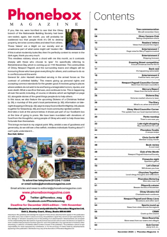 November 2025 | Phonebox Magazine 5ContentsPhonebox Magazine is owned and published by Phonebox Magazine Ltd, Unit 2, Stanley Court, Olney, Bucks MK46 5NHAdvertisers: We gratefully acknowledge the support of firms whose advertisements appear in this publication and, whilst every care is taken to ensure accuracy, the publishers regret they cannot accept responsibility for loss, damage or omission caused by error in the printing of an advertisement. Advertisements are accepted on the understanding that descriptions of goods and services are fair and accurate. All artwork is accepted on strict condition that permission has been given for use in this publication. Any reproduction of material, either advertising or editorial, is forbidden without written consent of the publishers. The publishers cannot accept responsibility for views expressed by contributors, or for the accuracy of claims made by advertisements appearing in this publication. Distribution may vary at the discretion of Phonebox Magazine Ltd.To advertise telephone (01234) 713298or email sales@phoneboxmagazine.comEmail articles and news to editorial@phoneboxmagazine.comwww.phoneboxmagazine.comTwitter: @Phonebox_magFacebook.com/PhoneboxmagDeadline for December 2025 edition - 14th November06 Tree commemorationWe will remember them08 Olney Camera Club Taking completition shots10 Readers%u2019 lettersViews from around the region 12 Entertainment 1 Huge crew for Mary Poppins musical 14 Entertainment 2 Shipping forecast16 Downing Street competition A local Christmas tree for No10 17 Bank raid It%u2019s happening nationwide 18 Entertainment 3It will be here, next year22 Newport Pagnell Councillor Corner More from the town councillors 24 Mercury ReportNews from the local council 25 Dickens DayVictorian market returns to town 26 The Diary What%u2019s on, when and where?28 Olney Ward Councillor Corner The update from our local representatives 30 Panto roundup There%u2019s one near you 32 Late night shoppingBuy now before the rush34 Phonebox Foodie A soopa recipe36 Chris Curtis MP Member%u2019s busy month38 Book review A cool read38 Club of the Month Newport Pagnell Historical Society40 Fireworks nightSparklers galore43 Let%u2019s DanceWill shows you how44 Churches Together Local clergy thoughts and refl ections48 Phonebox Motoring Mini ride, maxi fun 51 Pibworth column Beware the IDs of November 52 Olney Ukraine AidCharitable work continues 53 Newport Pagnell and Olney Lions Donations and other work 54 Sports round up News from clubs across the regions 55 CRMK Crank up the volume 56 News Round Up More news from our towns and villages 62 Quiz Corner Jump to it, er...If you, like me, were horrifi ed to see that the Olney branch of the Nationwide Building Society had been ram-raided, again, last month, you will probably be saddened too that people think it%u2019s OK to destroy property, terrorise communities and steal from others.These %u2018takers%u2019 are a blight on our society and an unwelcome part of what some might call %u2018modern life.%u2019 If this is what modernity looks like, then I%u2019m perfectly content to remain in the dark ages, thank you very much.This mindless robbery struck a chord with me this month, as it contrasts sharply with those who choose to %u2018give.%u2019 I%u2019m specifi cally referring to Remembrance Day, which is coming up on 11th November. The communities of Olney, Newport Pagnell, and the surrounding towns and villages will be honouring those who have given everything for others, and continue to do so in confl icts around the world.General Sir John Hackett described serving in the armed forces as %u2018the contract of unlimited liability.%u2019 This means giving up personal rights and accepting common standards for the greater good. It involves going to places where soldiers do not wish to be and facing unimaginable horrors, injuries, and even death. What a sacrifi ce that was, and continues to be. This is happening all over the world, including, of course, in Ukraine, which we highlight on page 52, alongside stories of the great things people do to help others.In this issue, we also feature the upcoming Dickens of a Christmas festival (p. 25), a roundup of this year%u2019s local pantomimes (p. 30), information on latenight shopping in Olney (p. 32), ways to enjoy food on Bonfi re Night (p. 34), places to gather for fi reworks (p. 40), and much more community-spirited content.And take a look at the picture below; it shows just part of our foodbank box at the time of going to press. We have been inundated with donations of food from the thoughtful, caring people of Olney who wish to help those less fortunate than themselves.This brings me back to my original point. Why, amidst a sea of goodness and generosity, do we still see a few selfi sh, mindless individuals fl oating about? I can%u2019t quite understand it%u2026Ron Hall, Editor