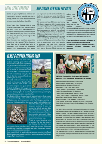 54 Phonebox Magazine | November 2025LOCAL SPORT ROUNDUP NEW SEASON, NEW NAME FOR COLTSSome of you might have noticed an important change to our club name and badge, which has been made to refl ect who we are and what we stand for.Olney Town Colts Football Club is now Olney Football Club, and the removal of the word %u2018Colts%u2019 is to acknowledge and recognise the fast-growing number of girls and ladies that now play for our club and who bring skill, passion, and energy to the pitch every week.Over the years, our club has grown into something truly special. We%u2019ve become more than just a football club, we%u2019re a community that thrives on inclusivity, diversity and togetherness. Our teams now represent a wide and wonderful mix of players at every age group from U5s to U18s as well as ladies, men%u2019s and veterans teams.This season we have 34 teams and nearly 500 players registered with the club, and as well as participating in fi ve diff erent football leagues, we will soon be launching the FA%u2019s Comets programme, which is recreational, pan-disability football training for disabled (& SEN) boys and girls aged between 5 and 11. For 2025/26 we%u2019re continuing with our club referee mentoring programme, whereby we train and fully support new refs, and as ever, we desperately need more people to volunteer and gain their coaching qualifi cations so that we can continue to meet player demand. Most courses are online and costs are covered by the club.We already have over 60 FA qualifi ed coaches (including UEFA B badges), and we are also fortunate to have a very experienced female coaching mentor who not only has coached at Olney FC for eight years, but she is also a technical coach with Bedfordshire FA.If you would like to become a referee or a coach, contact www.olneyfc.co.uk.Thank you to all of our players, managers, coaches, referees, volunteers and sponsors.OLNEY & CLIFTON FISHING CLUBThis last month has seen many anglers reporting great silver fi sh action with double-fi gure bags being caught on diff erent stretches of our waters. I would recommend going out as much as possible to make the most of the current situation, as the fi sh are defi nitely biting, but the fear is that the seasonal fl oods are probably not far away.The club held our annual two rod match at the start of October. This match attracts both match and specimen anglers and gives prizes for both the biggest fi sh caught and the one that is the highest percentage of the club record, whichever species. Displaying his all-round ability to claim this year%u2019s trophy was popular ex-committee man Matt Farr.The Bedford Winter league has all started, but the fi rst match at Kempston being a write off for the Olney team. Last week at Willington saw an improvement with Paul Hodgson getting a deserved third place with a nice bag of quality fi sh weighing in at 7lbs 11oz. Showing the disparity between sections, I won my section by default with just 3lbs 15oz of small perch and gudgeon. The match winner came from the same section with nearly 13lbs of chub, so it proves you can only catch what is in your peg. Finally, a record-breaking note to end on. For the fi rst time in our history the club has over one hundred junior members. Let%u2019s hope that as many of them as possible start catching immediately and enjoy themselves enough to go on to become adult members.Next month I look forward to bringing you a report on the Royal British Legion open match and Olney hosting a round of the Winter league. Tight lines, DamonOLNEY BOWLING CLUBOBC Club Competition fi nals were held over the weekend 12-14 September with winners as follows:Men%u2019s Singles Championship: Colin CookMen%u2019s 2-Wood Singles: Mick RichardsonMen%u2019s Handicap Singles: JD Boshoff Men%u2019s Pairs: Colin Cook, Neil CliftonLadies Singles Championship: Liz MurdochLadies Handicap Singles: Liz MurdochLadies Pairs: Noriko Heyes, Wendy CollyerLadies 2-Wood Pairs: Liz Murdoch, Wendy CollyerMixed Pairs: Vicki Horton, Gerald WilsonScorpion Shield: Colin Millward, Liz MurdochOpen Triples: JD Boshoff , Howarth Munday, Colin CookOpen Rinks: Norman Crouch, Colin Millward, Lee Thomas, Gerald WilsonThe Hilary Brock one-day competition was held on Sunday 28th September with 24 pairs taking part in 2 groups, each pair playing 4 games. This was followed by semi-fi nals and then a fi nal. After fi ve exciting ends in the fi nal the eventual winners were Mike Thompson and Paul Megeary who defeated Claire Ridpath and Lee Thomas. Sandy Brock presented the trophy and thanks was given to the Brock family for sponsoring the day.The end of season President v Captains was held on Wednesday 1st October with the President%u2019s Team victorious 87-71. This was followed by a lovely meal sponsored by the President and a raffl e which raised %u00a3238 in aid of Macmillan Cancer.The rinks will have closed for Winter when you read this. We look forward to seeing some new faces at our next Open Day in April 2026.54 Phonebox Magazine | November 2025