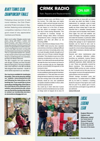 November 2025 | Phonebox Magazine 55Autumn%u2019s almost over, and Winter is on the horizon. The chilly days and nights will turn colder, and we may get snow, but hopefully, for now, the only %u2018precipitation%u2019 we can expect is in the form of leaves and rain, which, on average, it does for one day in three during November. This is expected to increase, though, as climate change takes eff ect. Increased temperatures mean a change in weather patterns, and that will aff ect us all, including CRMK.Hot or cold, there are always issues. If hot, the CRMK metal security door expands and catches on its frame, making it diffi cult to open and close. Conversely, when cold, it can get draughty despite draught-proof strips and one of those material draught excluders. This situation is just one of the ongoing considerations we have to think about. In an ideal world we would perhaps change the door, but money is an issue as we are surviving only by our fi ngernails, and we cannot justify the expense at this moment in time.Our fi nancial situation means that we have to look carefully at what we spend members%u2019 subscriptions on. That said, there are some things we have to spend our money on apart from the running costs of the radio station. Security would be one, and operational computers would be another. In short, when we have to spend, we do!You could say it never rains but it pours when it comes to maintenance at our studio as things seem to happen all at once. At present we have an issue with our instant hot water tap which has failed. A cheap replacement, for example, costs at least two presenters%u2019 monthly subs but what quality are those cheap taps? It was also reported that a rainwater downpipe has come apart and its brackets have broken. Once again, hot and cold weather can cause shrinkage in these plastic products and make the brackets, in particular, brittle over time. Almost certainly, someone will be raiding their garage to see if replacement brackets can be found at zero cost to CRMK. At the time of writing we are awaiting a quote for a more serious faulty equipment matter. When received, a decision will have to be made!General and minor maintenance jobs such as replacing defective cables, touching up paintwork, buying fl owers for the garden and so forth are regular additional expenses, albeit relatively low in cost. These are generally covered by Board members. This benevolence is helping CRMK survive as costs continue to rise. It should not be this way, but our only regular income is through presenters%u2019 subscriptions and one sponsor.Climate change, increased costs and maintenance %u2013 no matter what it is, CRMK will try its best to maintain a working studio for anyone of any age to use. Could that be you? If so, please get in touch, come and see us and give it a go while we are still here!www.crmk.co.ukRain, Repairs and ReplacementsOLNEY TENNIS CLUB CRMK RADIOCHAMPIONSHIP FINALSFollowing a busy summer of early round matches, the Club Championship Finals took place in September, featuring some extremely competitive matches in front of a good crowd of very appreciative members and friends. Men%u2019s and Ladies%u2019 Singles events took place, along with Men%u2019s, Ladies%u2019 and Mixed Doubles, with Plate matches for those who had lost in the fi rst round of the events. Congratulations to all the winners.Junior Club Night has been running with an enthusiastic band of juniors attending. This is a supervised session for Juniors, so why not join us from 4 pm every Friday? There is a small charge for non-members, but they are always welcome.The Box Leagues are now underway with Singles, Doubles and Vets Doubles Matches taking place. The Autumn/Winter inter-club matches in the MK and Beds Vets leagues have restarted %u2013 results of which will be reported in our next News.Our courts are available for booking by the public. This can be done by visiting our website www.olneytennis.club and following the instructions on the booking link. If you would like to know more about membership of the Club or the coaching we off er, please go to our website www.olneytennis.club, where you can fi nd all the membership details, or contact our membership secretary at otcmembmership@gmail.comEngland Women%u2019s Captain Leah Williamson visited her home town of Newport Pagnell FC to cheer on her brother Jacob and the rest of the team.LOCAL LEGENDLEAHNovember 2025 | Phonebox Magazine 55