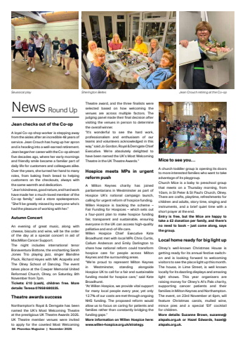 56 Phonebox Magazine | November 2025Jean checks out of the Co-opA loyal Co-op shop worker is stepping away from the aisles after an incredible 48 years of service. Jean Crouch has hung up her apron and is heading into a well-earned retirement. Jean began her career with the Co-op almost fi ve decades ago, where her early mornings and friendly smile became a familiar part of daily life for customers and colleagues alike. Over the years, she turned her hand to many roles, from baking fresh bread to helping customers on the checkouts, always with the same warmth and dedication. %u201cJean%u2019s kindness, good nature, and hard work have made her a much-loved member of the Co-op family,%u201d said a store spokesperson. %u201cShe%u2019ll be greatly missed by everyone who%u2019s had the pleasure of working with her.%u201dAutumn Concert An evening of great music, along with cheese, biscuits and wine, will be the order of the day at a special concert in aid of MacMillan Cancer Support.The night includes international tenor Bonaventura Bottone, the enchanting Sarah Jones Trio playing jazz, singer Blandine Pluck, Richard Hayes with MK Acapella and The Olney School of Dancing. The event takes place at the Cowper Memorial United Reformed Church, Olney, on Saturday, 8th November from 7pm. Tickets: %u00a310 (cash), children free. More details: Teresa 07958 680325.Theatre awards successNorthampton%u2019s Royal & Derngate has been named the UK%u2019s Most Welcoming Theatre at the prestigious UK Theatre Awards 2025. UK Theatre member venues were invited to apply for the coveted Most Welcoming Mice to see you%u2026A church toddler group is opening its doors to more interested families who want to take advantage of its playgroup.Church Mice is a baby to preschool group that meets on a Thursday morning, from 10am, in St Peter & St Paul%u2019s Church, Olney. There are crafts, playtime, refreshments for children and adults, story time, singing and instruments, and a brief quiet time with a short prayer at the end. Entry is free, but the Mice are happy to take a %u00a32 donation per family, and there%u2019s no need to book %u2013 just come along, says the group.Local home ready for big light upOlney%u2019s well-known Christmas House is getting ready for its annual festive switchon and is looking forward to welcoming visitors to see the place light up this month.The house, in Lime Street, is well known locally for its dazzling displays and amazing light shows. This year organisers are raising money for Olney%u2019s Al%u2019s Pals charity, supporting cancer patients and their families in Milton Keynes and Northampton. The event, on 23rd November at 6pm, will feature Christmas carols, mulled wine, mince pies and a special %u2018Elf%u2019 cocktail for children. More details: Suzanne Brown, suzanne@alspals.org.uk or Hazel Edwards, hazel@alspals.org.uk.Theatre award, and the three fi nalists were selected based on how welcoming the venues are across multiple factors. The judging panel made their fi nal decision after visiting the venues in person to determine the overall winner. %u201cIt%u2019s wonderful to see the hard work, professionalism and enthusiasm of our teams and volunteers acknowledged in this way,%u201d said Jo Gordon, Royal & Derngate Chief Executive. We%u2019re absolutely delighted to have been named the UK%u2019s Most Welcoming Theatre in the UK Theatre Awards.%u201dHospice meets MPs in urgent reform pushA Milton Keynes charity has joined parliamentarians in Westminster as part of Hospice UK%u2019s national campaign launch, calling for urgent reform of hospice funding.Willen Hospice is backing the scheme %u2013 Fair Funding for Hospices %u2013 which sets out a four-point plan to make hospice funding fair, transparent and sustainable, ensuring everyone in the UK can access high-quality palliative and end-of-life care.Willen Hospice Chief Executive Kate Broadhurst met with local MPs Chris Curtis, Callum Anderson and Emily Darlington to share how national reform could transform hospice care for people across Milton Keynes and the surrounding areas.%u201cWe%u2019re proud to represent Milton Keynes in Westminster, standing alongside Hospice UK to call for a fair and sustainable funding model for hospice care,%u201d said Kate Broadhurst.%u201cAt Willen Hospice, we provide vital support for many local people every year, yet only 12.7% of our costs are met through ongoing NHS funding. The proposed reform would allow us to focus on caring for patients and families rather than constantly bridging the funding gaps.%u201dMore information on Willen Hospice here: www.willen-hospice.org.uk/strategy.News Round UpSeussical play Sherington Belles Jean Crouch retiring at the Co-op