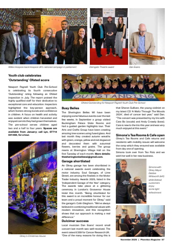November 2025 | Phonebox Magazine 57Youth club celebrates %u2018Outstanding%u2019 Ofsted scoreNewport Pagnell Youth Club Pre-School is celebrating its fourth consecutive %u2018Outstanding%u2019 rating following an Ofsted inspection in July. The report praised the highly qualifi ed staff for their dedication to exceptional care and education. Inspectors highlighted the key-person approach, which fosters strong bonds and confi dence in children. A focus on health and activity was evident when children harvested and enjoyed carrots they had grown themselves. The pre-school serves children aged two and a half to four years. Spaces are available from January; call Lyn, 07714 041494, for a tour.Busy BellesThe Sherington Belles WI have been enjoying some fabulous events over the last few weeks. In September a group visited Buckingham Palace State Rooms and had a guided garden highlights tour. Their Arts and Crafts Group have been creating amazing tree scenes using fused glass. And last month they created autumn wreaths with green, orange, yellow and red dogwood and decorated them with autumnal fl owers, berries and grains. The group meets at Sherington Village Hall on the fi rst Tuesday of each month. More details: thesheringtonbelleswi@gmail.com.Garage shortlistedAn Olney garage has been shortlisted in a national awards event celebrating the motor industry. Soul Garages, of Lime Street, are among the fi nalists in the Motor Trader Industry Awards 2025, listed in the %u2018Independent Garage of the Year%u2019 category. The awards take place at a glittering ceremony in London%u2019s Grosvenor House Hotel this month. %u201cBeing shortlisted for this award is an incredible honour for our team and a proud moment for Olney,%u201d said the garage%u2019s Colin Gleghorn. %u201cWe%u2019ve always believed in combining traditional values with modern innovation, and this recognition shows that our approach is making a real diff erence.%u201dDulcimer successLocal musician Dan Evans%u2019 recent small concert last month was well-received. The event raised %u00a3359 for Cancer Research UK. %u201cOne of the many reasons for doing this is Derngate Theatre awardOfsted Outstanding for Newport Pagnell Youth Club Pre-SchoolWillen Hospice back Hospice UK%u2019s national campaign in parliament Dan Evansthat Sharon Sullivan, the young violinist on my latest CD %u2018A Waltz Through The Woods 2024%u2019, died of cancer last year,%u201d said Dan. %u201cThe concert was presented by my trio with Cara Bo (vocals) and Andy Crowdy (bass). Cara is new to the trio this year and was very much enjoyed at this event.%u201dSimona%u2019s Tea Rooms & Cafe openOlney%u2019s Tea Rooms and Cafe returns and residents with mobility issues will welcome the ramp which they ensured was available from day one of opening. Simona took over from Tea Pots and we wish her well in her new business.Olney%u2019s Christmas HouseSimona with Olney Mayor Debbie Whitworth (left) while (below) customers enjoy some light refreshment