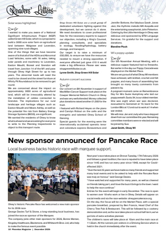10 Phonebox Magazine | December 2025Solar woes highlightedDear SirI wanted to make you aware of a National Signifi cant Infrastructure Project (NSIP) called Green Hill Solar, which is a proposal to build a 3000 acre solar farm on agricultural land between Walgrave and Lavendon, spanning nine rural villages. One of the things that we have become aware of is that all of the HGVs and Abnormal Load Vehicles, some with 16 axles, taking solar panels and machinery to Lavendon, Easton Maudit, Bozeat and Grendon will travel from Junction 14 of the M1 and pass through Olney High Street for up to two years. The abnormal loads will need the road to be closed and the street furniture at Whirly Pit Roundabout to be removed to get round.We are concerned about the impact on approximately 3000 acres of agricultural land, which will be irrevocably altered by the installation of cables connected to Grendon. The implications for our rural landscape and heritage villages such as Easton Maudit and Mears Ashby, as well as the potential fi re risk from Battery Energy Storage Systems (BESS), are signifi cant. We wanted the residents of Olney to know what is ahead and we are asking for everyone to write to the Planning Inspectorate to object to this transport route. Stop Green Hill Solar are a small group of dedicated volunteers fi ghting against this development, but we cannot do it alone. We need donations to cover professional fees for the necessary experts to support our objection, including a King%u2019s Counsel, planning consultants, and specialists in ecology, fl ooding/hydrology, battery storage, and transport. Our target is to raise a minimum of %u00a350,000, to ensure we have the resources needed to mount a strong opposition. If everyone aff ected just gave %u00a310 it would make a big diff erence. Please see: www.stopgreenhillsolar.co.uk. Lynne Smith, Stop Green Hill SolarAutumn concert successDear SirOur concert on 8th November in support of MacMillan Cancer Support took place at the Cowper Memorial Reform Church in Olney and was very well attended. Money collected plus donations raised another %u00a31,000 for the trust. I featured with Richard Heyes on the piano and Carolyn Ridout on the cello and the energetic and talented Olney School of Dancing. Special guests for the evening were the internationally acclaimed operatic tenor and coloratura soprano Bonaventura and Jennifer Bottone, the fabulous Sarah Jones Jazz, the rhythmic melodic MK Acapella and the entertaining saxophonist John Pinkerton. Catering by the Little Hermitage in Olney was delicious and sponsored by BTM Language Services. I%u2019m grateful for the support and donations.Blandine PluckWI%u2019s poppy updateDear SirOur 5th November Annual Meeting, with a delicious supper featured had no fi reworks. But earlier in the day our Poppy Cascade was displayed on the Market Place. We are very proud of what Olney WI members have achieved, with knitted, crochet and felt poppies, and many hours of assembling has brought so many lovely comments from passers-by.A poignant moment came on Remembrance Day for Mrs Susie Humphrey who laid our poppy wreath. Susie, 94, is our oldest member. She was eight when war was declared, evacuated to Somerset at 10, back for the London Blitz at 12 and out to work at 14 when war ended.We will miss Jan and Judy who have stepped down from our committee this year. Remaining committee members were re-elected and will be joined by Sue. Janet Smith, Olney WINew sponsor announced for Pancake RaceLocal business backs historic race with marquee support.Olney%u2019s historic Pancake Race has welcomed a new main sponsor for its 2026 race.George Davies Turf & Stone, a long-standing local business, has joined the race as sponsor of the Marquee. The company joins other main sponsors for 2026, Bonne Maman, Kingsley Healthcare, Blackstone, and Whitworth Bros. Ltd, who help to make the famous event possible. Next year%u2019s race takes place on Shrove Tuesday, 17th February 2026 and follows a great tradition; the race is reputed to have taken place since 1445 and has run every year since 1948, except for Covidaff ected 2021. %u201cOver the last 25 years we have made so many friends and supported many local events and to be asked to help with the Pancake Race was truly an honour,%u201d said George Davies. %u201cI have watched and supported for many years, as well as cheered on friends taking part, and I love the buzz it brings to the town. I want to help the race continue.%u201dEntries for the event will begin in early December. The race is open to women over 18 who work or live in Olney. Details will appear on social media and via the race website: olneypancakerace.org.On the day, the focus will be on the Market Place, with a special pancake breakfast, prepared by Ben Francis, Head Chef of the Cherry Tree Pub & Restaurant. This will be followed by a cookery demonstration and, as the race takes place in school half-term, we%u2019ve got lots of extra activities planned. The children%u2019s races will take place at 10am and the main race at 11.55am. All the runners join visitors in a Shriving Service which is held in the church immediately after the event. Stop Green Hill Solar are a small group of Rea%u0016 rs%u2019 Le%u0010 ers