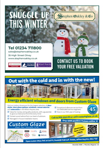 December 2025 | Phonebox Magazine 15Registered CompanyOpen 6 days (Mon-Sat) at Unit 8, Denbigh Hall Ind. Estate, Milton Keynes, MK3 7QTDenbigh Hall Drive Denbigh Hall DriveWatling Street V4Standing Way H8 A421 A5Denbigh Hall Denbigh HallWhaddon WayOver 6000 positive reviews online ShowroomOpen 6 Days a WeekOut with the cold and in with the new!Energy e%u0082 icient windows and doors from Custom GlazeNowinour45thYearof improving your home45 sCall 01908 650140 or visit customglaze.co.ukVisit our indoor showroom for the largest selection of door styles, door glass options, windows, conservatoriesand extensions in the Milton Keynes area%uf0fe Value for money and quality products, with a guarantee to give our best price first time every time!%uf0fe Honest sound advice from our team of advisors %uf0fe Managed in-house installation teams %uf0fe Exceptional a%u0081 ercare service from our dedicated service engineers%uf0fe Now in our 45th year of tradingTel 01234 711800sales@stephenoakley.co.uk35 High Street Olneywww.stephenoakley.co.ukCONTACT US TO BOOK YOUR FREE VALUATIONSNUGGLE UPTHIS WINTERSNUGGLE UPTHIS WINTER