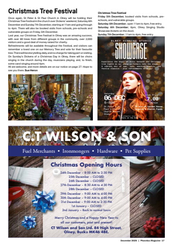 December 2025 | Phonebox Magazine 17C.T WILSON & SONFuel Merchants %u2022 Ironmongers %u2022 Hardware %u2022 Pet Supplies24th December %u2013 8:00 AM to 2:30 PM25th December %u2013 CLOSED26th December %u2013 CLOSED27th December %u2013 8:30 AM to 4:30 PM28th December %u2013 CLOSED29th December %u2013 9:00 AM to 4:00 PM30th December %u2013 9:00 AM to 4:00 PM31st December %u2013 9:00 AM to 2:30 PM1st January %u2013 CLOSED2nd January %u2013 Back to normal hoursMerry Christmas and a Happy New Year to all our customers, past and present!CT Wilson and Son Ltd. 84 High Street, Olney, Bucks MK46 4BE.Christmas Opening Hours27th December %u2013 8:30 AM to 4:30 PM29th December %u2013 9:00 AM to 4:00 PM30th December %u2013 9:00 AM to 4:00 PM31st December %u2013 9:00 AM to 2:30 PMOnce again, St Peter & St Paul Church in Olney will be holding their Christmas Tree Festival in the church over Dickens%u2019 weekend, Saturday 6th December and Sunday 7th December, starting at 11am and going through to 4pm. There will also be booked visits from schools, pre-schools and vulnerable groups on Friday, 5th December.Last year, our Christmas Tree Festival in Olney was an amazing success, with over 80 trees from diff erent groups in the community, over 2,000 visitors and a good deal of money raised for charity.%u00a0Refreshments will be available throughout the Festival, and visitors can remember a loved one on our Memory Tree and vote for their favourite tree. There will be storytelling daily, and no charge for taking part or visiting.On Sunday%u2019s Dickens of a Christmas Day in Olney, there will be choirs singing in the church during the day, musicians playing, and, to fi nish, some carol singing around 4pm.All are welcome, and more details are on our notice on page 27. Hope to see you there. Sue HeronChristmas Tree Festival Christmas Tree FestivalFriday 5th December, booked visits from schools, preschools, and vulnerable groups.Saturday 6th December, open 11am to 4pm, free entry.Saturday 6th December, 6pm, Olney Singing Studio Showcase (tickets on the door).Sunday 7th December, 11am to 4pm, free entry.
