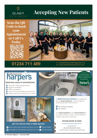 20 Phonebox Magazine | December 2025E | olney@theprivatedentalgroup.co.ukW | www.theolneydentalpractice.co.ukAccepting New Patients01234 711 489Scan the QRCode to bookyourAppointmentor Call UsTodayBESPOKE, QUALITY BATHROOMS At Bathrooms by Harpers, we supply and fi t your dream bathroom %u2013 and manage the whole process from start to fi nish. No chasing trades No stressJust expert guidance on the best products for your space and your needs %u2013 we even take the rubbish away when we%u2019re done!Showroom visits by appointmentSupply & installationFREE consultationsAccess to brands at different price pointsMobility bathrooms tailored to your needsESTABLISHED IN 2000SHOWROOM(BY APPOINTMENT ONLY)7 PARK FARM | TYRINGHAM | MK16 9EDGET IN TOUCH FOR A FREE QUOTEWWW.BATHROOMSBYHARPERS.CO.UK 01908 618591INFO@BATHROOMSBYHARPERS.CO.UK 07748 595356partnering with Olney%u2019s Noble Signature Kitchens to bring you supplied and fi tted kitchens