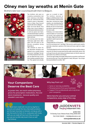 December 2025 | Phonebox Magazine 21Olney men lay wreaths at Menin GateBrothers take town council laurel with them to Belgium.Two brothers, who were so moved by a summertime %u2018Last Post%u2019 ceremony at the Menin Gate war memorial that they vowed to return in November, took an Olney Town Council wreath with them to Belgium.Nigel and Scott Birrell, from Olney, took a short holiday in the European state last summer to visit war graves near Ypres, and attended the 8pm Last Post ceremony at the historic Menin Gate memorial. The evening event has been held every night since 1927, apart from the years of the German occupation during World War 2. %u201cWe resolved to return for the November Armistice and applied to lay a wreath during the service,%u201d said Nigel. %u201cAs men from Olney had been lost in the war, we asked the town council if we could lay a wreath for them too. They agreed and actually gave us a wreath to take.%u201dThe brothers returned to Belgium on 9th November in time for the Armistice ceremony two days later, carrying two poppy wreaths, one remembering fi ve men of Olney and one for three Birrells, who are not close family, but whose names are carved in the stone walls.Following a one-minute silence, a band rendition of %u2018I vow to thee my country%u2019 and a lament from the pipes, Nigel and Scott were signalled to walk forward and lay their wreaths.%u201cPoppy petals lay on the ground from the morning service,%u201d said Nigel. %u201cWe turned to walk forward, wreaths were laid, a step back, a gesture of the head, and it was a right turn, single fi le back. %u201cThe bands played as each one marched off into the town, and then silence returned. As I stood, my eyes searched the walls covered with names. I felt as though those who were being remembered were not that far away and were aware of our eff orts not to forget. %u201cTomorrow night at 8pm the bugles will be back to sound the Last Post and the next and the next. They have played for nearly 100 years %u2013 let us hope that sound will last for another 100.%u201d