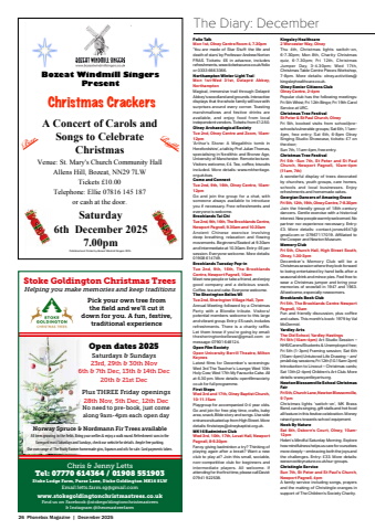 26 Phonebox Magazine | December 2025Folio TalkMon 1st, Olney Centre Room 4, 7.30pm%u2018You are made of Star Stuff: the life and death of stars%u2019 by Professor Andrew Norton FRAS. Tickets: %u00a36 in advance, includes refreshments, www.ticketsource.co.uk/folio or 0333 666 3366.Northampton Winter Light TrailMon 1st-Wed 31st, Delapr%u00e9 Abbey, NorthamptonMagical, immersive trail through Delapr%u00e9 Abbey%u2019s woodland and grounds. Interactive displays that the whole family will love with surprises around every corner. Toasting marshmallows and festive drinks are available, and enjoy food from local independent vendors. Tickets: from %u00a312.50.Olney Archaeological SocietyTue 2nd, Olney Centre and Zoom, 10am12pm%u2018Arthur%u2019s Stone: A Megalithic tomb in Herefordshire%u2019, a talk by Prof Julian Thomas, specialising in Neolithic and Bronze Age, University of Manchester. Remote lecturer.Visitors welcome, %u00a34. Tea, coff ee, biscuits included. More details: www.mkheritage.org.uk/oas.Come and ConnectTue 2nd, 9th, 16th, Olney Centre, 10am12pmGo and join the group for a chat, with someone always available to introduce you if necessary. Free refreshments and everyone is welcome.Brooklands Tai ChiTue 2nd, 9th, 16th, The Brooklands Centre, Newport Pagnell, 9.30am and 10.30amAncient Chinese exercise involving deep breathing, relaxation and flowing movements. Beginners/Seated at 9.30am and Intermediate at 10.30am. Entry: %u00a36 per session. Everyone welcome. More details: 01908 614749.Brooklands Tuesday Pop-inTue 2nd, 9th, 16th, The Brooklands Centre, Newport Pagnell, 10amMeet new people or take a friend, and enjoy good company and a delicious snack. Coff ee, tea and cake. Everyone welcome.The Sherington Belles WITue 2nd, Sherington Village Hall, 7pmAnnual Meeting followed by a Christmas Party with a Blondie tribute. Visitors/potential members welcome to this large and vibrant group. Entry: %u00a35 cash, includes refreshments. There is a charity raffle. Let them know if you%u2019re going by email: thesheringtonbelleswi@gmail.com or message: 07901 648124.Open Film SocietyOpen University Berrill Theatre, Milton KeynesLatest fi lms for December%u2019s screenings: Wed 3rd The Teacher%u2019s Lounge; Wed 10th Holy Cow; Wed 17th My Favourite Cake. All at 6.30 pm. More details: openfi lmsociety.co.uk for full programme.First StepsWed 3rd and 17th, Olney Baptist Church, 10-11.15amPlaygroup for accompanied 0-4 year olds. Go and join for free play time, crafts, baby area, snack, Bible story and songs. Use side entrance situated up from High Street. More details: fi rststeps@olneybaptist.org.uk.MK16 Badminton ClubWed 3rd, 10th, 17th, Lovat Hall, Newport Pagnell, 8-9.30pmFancy giving badminton a try? Thinking of playing again after a break? Want a new club to play at? Join this small, sociable, non-competitive club for beginners and intermediate players. All welcome. If attending for the fi rst time, please call David: 07941 922538.The Diary: December Kingsley Healthcare2 Worcester Way, OlneyThu 4th, Christmas lights switch-on, 6-7.30pm; Mon 8th, Charity Christmas quiz, 6-7.30pm; Fri 12th, Christmas Jumper Day, 3-4.30pm; Wed 17th, Christmas Table Centre Pieces Workshop, 7-8pm. More details: olney.activities@kingsleyhealthcare.co.uk.Olney Senior Citizens ClubOlney Centre, 2-4pmPopular club has the following meetings: Fri 5th Whist; Fri 12th Bingo; Fri 19th Carol Service at URC.Christmas Tree FestivalSt Peter & St Paul Church, OlneyFri 5th, booked visits from school/preschools/vulnerable groups; Sat 6th, 11am4pm, free entry; Sat 6th, 6-8pm Olney Singing Studio Showcase, tickets: %u00a37 on the door; Sun 7th, 11am-4pm, free entry.Christmas Tree FestivalFri 5th -Sun 7th, St Peter and St Paul Church, Newport Pagnell, 10am-4pm (11am, 7th)A wonderful display of trees decorated by churches, youth groups, care homes, schools and local businesses. Enjoy refreshments and homemade cakes.Georgian Dancers of Amazing GraceFri 5th, 12th, 19th, Olney Centre, 7-8.30pmJoin the friendly group of 18th century dancers. Gentle exercise with a historical interest. New people warmly welcomed. No partner nor experience necessary. Entry: %u00a33. More details: contact.jones4647@gmail.com or 07967117019. Affi liated to the Cowper and Newton Museum. Memory ClubFri 5th, Church Hall, High Street South, Olney, 1.30-3pmDecember%u2019s Memory Club will be a Christmas session where they look forward to being entertained by hand bells after a seasonal drink and mince pies. Feel free to wear a Christmas jumper and bring your memories of snowfall in 1947 and 1963. All welcome, especially newcomers.Brooklands Book ClubFri 5th, The Brooklands Centre Newport Pagnell, 10amFun and friendly discussion, plus coffee and cakes. This month%u2019s book: 1979 by Val McDermid.Yardley ArtsThe Old School, Yardley HastingsFri 5th (10am-4pm) Art Studio Session %u2013 NHS/Carers/Students & Unemployed free; Fri 5th (1-3pm) Framing session; Sat 6th (10am-4pm) Untutored Life Drawing %u2013 am/pm/all day sessions; Fri 12th (10.15am-2pm) Introduction to Linocut %u2013 Christmas cards; Sat 13th (2-4pm) Children%u2019s Art Club. More details: www.yardleyarts.org.Newton Blossomville School Christmas FairFri 5th, Church Lane, Newton Blossomville, 5-7pmChristmas lights %u2018switch-on%u2019, MK Brass Band, carols singing, gift stalls and hot food all feature in this festive celebration. Money raised goes towards school equipment.Nook By NatureSat 6th, Osborn%u2019s Court, Olney, 10am12pmHelen%u2019s Mindful Saturday Morning. Explore how mindfulness helps us care for ourselves more deeply %u2013 embracing both the joys and the challenges. Entry: %u00a333. More details: www.nookbynature.co.uk/our-groups.Christingle ServiceSun 7th, St Peter and St Paul%u2019s Church, Newport Pagnell, 4pmA family service including songs, prayers and the making of Christingle oranges in support of The Children%u2019s Society Charity. BarRaffleBozeat Windmill SingersPresentChristmas
