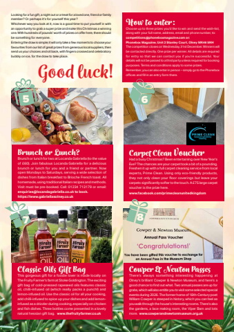 December 2025 | Phonebox Magazine 29Looking for a fun gift, a night out or a treat for a loved one, friend or family member? Or perhaps it%u2019s for yourself this year?Whichever way you look at it, now is a good time to put yourself in with an opportunity to grab a super prize and make this Christmas a winning one. With hundreds of pounds%u2019 worth of prizes on offer here, there should be something for everyone.Entering the draw is simple; it will only take a few moments to choose your favourites from our list of great prizes from generous local suppliers, then send us your choices and sit back, with fingers crossed and celebratory bubbly on ice, for the draw to take place.How to enter:Choose up to three prizes you%u2019d like to win and send the wish-list, along with your full name, address, email and phone number, to:competitions@phoneboxmagazine.com or:Phonebox Magazine, Unit 2 Stanley Court, Olney MK46 5NHThe competition closes on Wednesday, 31st December. Winners will be contacted directly. One prize per winner. All details are required for entry so that we can contact you if you%u2019re successful. Your details will not be passed to a third party unless required for booking purposes. Terms and conditions apply to some prizes.Remember, you can also enter in person %u2013 simply go to the Phonebox offices and fill in an entry form there.Brunch or Lunch?Brunch or lunch for two at Locanda Gabriella (to the value of %u00a360). Join fabulous Locanda Gabriella for a delicious brunch or lunch for you and a friend or partner. Now open Mondays to Saturdays, serving a wide selection of dishes from Italian breakfast to Brioche French toast. All homemade, using traditional Italian recipes and methods. Visit must be pre-booked. Call: 01234 713179 or email: enquiries@locandagabriella.co.uk to book.https://www.gabriellasolney.co.ukCarpet Clean VoucherHad a busy Christmas? Been entertaining over New Year%u2019s Eve? The chances are your carpet took a bit of a pounding. Freshen it up with a full carpet cleaning service from local experts, Prime Clean. Using only eco-friendly products, they not only clean your floor coverings but leave your carpets significantly softer to the touch. A %u00a375 large carpet voucher is the prize here.www.facebook.com/primecleanunitedkingdomClassic Oils Gift BagThis gorgeous gift for a foodie lover is made locally on The Fruity Farmer's farm at Stoke Goldington. The exciting gift bag of cold-pressed rapeseed oils features classic oil, chilli-infused oil (which really packs a punch!) and lemon-infused oil. Use the classic oil for all your cooking, add chilli-infused to spice up your dishes and add lemoninfused as a drizzler during cooking, especially on chicken and fish dishes. Three bottles come presented in a lovely natural hessian gift bag. www.thefruityfarmer.co.ukCowper & Newton PassesThere%u2019s always something interesting happening at Olney%u2019s brilliant Cowper & Newton Museum, and here%u2019s a good chance to find out what. Two annual passes are up for grabs, which will also entitle you to visit some selected special events during 2026. The former home of 18th-Century poet William Cowper is steeped in history, which you can feel as you walk through the house%u2019s interesting rooms. There%u2019s also the gardens, a lace making room, the Viper Barn and lots more. www.cowperandnewtonmuseum.org.uk5 67 8Good luck!