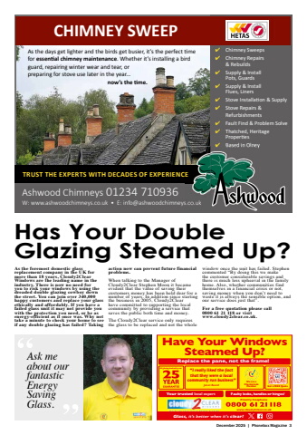 December 2025 | Phonebox Magazine 3Replace the pane, not the frame!Have Your Windows Steamed Up?Your trusted local expert Faulty locks, handles or hinges?Priority freephonewww.cloudy2clear.co.ukAll glazing backed by our %u201cI really liked the fact that they were a local community run business%u201dJanet BeardWe are a Checkatrade Member Get a FREE QuoteGlass, it%u2019s better when it%u2019s clear! Has Your Double Glazing Steamed Up?Ask me about our fantastic Energy Saving Glass.As the foremost domestic glass replacement company in the UK for more than 18 years, Cloudy2Clear Windows are the leading name in the industry. There is now no need for you to risk your windows by using the dreaded double glazing cowboy down the street. You can join over 340,000 happy customers and replace your glass ethically and affordably. If you have a failed glass unit it may not provide you with the protection you need, or be as energy-efficient as it once was. Why not take a minute to check your home to see if any double glazing has failed? Taking action now can prevent future financial problems.When talking to the Manager of Cloudy2Clear Stephen Moon it became evident that the value of saving their customers money has been held dear for a number of years. In addition since starting the business in 2005, Cloudy2Clear have committed to supporting the local community by providing a service that saves the public both time and money.The Cloudy2Clear service only requires the glass to be replaced and not the whole window once the unit has failed. Stephen commented %u201cBy doing this we make the customer considerable savings and there is much less upheaval in the family home. Also, whether communities find themselves in a financial crisis or not, saving money when you don%u2019t need to waste it is always the sensible option, and our service does just that%u201d.For a free quotation please call 0800 61 21 118 or visit www.cloudy2clear.co.uk.Ashwood Chimneys 01234 710936W: www.ashwoodchimneys.co.uk %u2022 E: info@ashwoodchimneys.co.uk%u2714 Chimney Sweeps%u2714 Chimney Repairs & Rebuilds%u2714 Supply & Install Pots, Guards%u2714 Supply & Install Flues, Liners%u2714 Stove Installati on & Supply %u2714 Stove Repairs & Refurbishments %u2714 Fault Find & Problem Solve %u2714 Thatched, Heritage Properti es%u2714 Based in OlneyCHIMNEY SWEEPW: www.ashwoodchimneys.co.uk %u2022 E: info@ashwoodchimneys.co.ukTRUST THE EXPERTS WITH DECADES OF EXPERIENCEAs the days get lighter and the birds get busier, it%u2019s the perfect ti me for essenti al chimney maintenance. Whether it%u2019s installing a bird guard, repairing winter wear and tear, or preparing for stove use later in the year... now%u2019s the ti me.