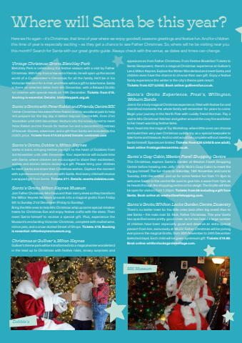30 Phonebox Magazine | December 2025appearances from Father Christmas. From Festive Breakfast Tickets to Santa Sleepovers, there%u2019s a magical Christmas experience at Gulliver's Land, Milton Keynes. Explore the Winter Wonderland and meet Santa, and children even have the chance to choose their own gift. Enjoy a festive family experience this winter in the city's theme park resort.Tickets: from %u00a327 (child). Book online: gulliversfun.co.uk.Santa%u2019s Grotto Experience, Frost%u2019s, Willington, Woburn SandsJoin in for a truly magical Christmas experience, fi lled with festive fun and cherished moments the whole family will remember for years to come. Begin your journey in the North Pole with cuddly friend Norman. Pay a visit to Mrs Christmas%u2019 Kitchen and gather around the cosy fi re and listen to her heart-warming festive tales.Next, head into the magical Toy Workshop, where little ones can choose and build their very own Christmas cuddly toy as a special keepsake to take home and treasure. And no visit would be complete without meeting Santa himself. Spaces are limited. Tickets: from %u00a335 (child & one adult), book online: frostsgardencentres.co.uk.Santa%u2019s Cosy Cabin, Weston Favell Shopping CentreThis Christmas, explore Santa%u2019s Garden at Weston Favell Shopping Centre before heading into Jolly Old St Nick%u2019s Cosy Cabin to meet the big guy himself. The fun starts on Saturday, 16th November and runs to Tuesday, 24th December. Join us for some festive fun from 11-3pm to welcome Santa to the centre! Be sure to give him a wave from 1pm as he heads through the shopping centre on his sleigh. The Grotto will then be open for visitors from 1.30pm. Tickets: from %u00a36 including a gift from Santa. Book online at: westonfavellshopping.com.Santa%u2019s Grotto, Whilton Locks Garden Centre, DaventryThere%u2019s no better treat for the little ones (and often big ones!) than to see Santa %u2013 the main man St. Nick, Father Christmas. This year Santa has specifi ed some pretty good cheer as he has heard a large number of children have been especially good and deserve an extra special present from him, exclusively at WLGV. Father Christmas will be joining everyone in the magical Grotto, from 30th November to 24th December (selected days). Each child will be given a premium gift. Tickets: %u00a319.99. Book online: whiltonlocksgardenvillage.com.Here we Ho again %u2013 it%u2019s Christmas, that time of year where we enjoy goodwill, seasons greetings and festive fun. And for children this time of year is especially exciting %u2013 as they get a chance to see Father Christmas. So, where will he be visiting near you this month? Search for Santa with our great grotto guide. Always check with the venue, as dates and times can change.Vintage Christmas Grotto, Bletchley ParkBletchley Park is celebrating the festive season with a visit by Father Christmas. With help from a few extra friends, he will open up the secret world of a Codebreaker%u2019s Christmas for all the family. He%u2019ll be in his Victorian Mansion for a chat, and there will be a gift to take home. Santa is there on selected dates from 6th December, with a Relaxed Grotto for children with special needs on 19th December. Tickets: from %u00a315. Booking is essential. Details: bletchleypark.org.ukSanta%u2019s Grotto with Peter Rabbit and Friends, Centre:MKFather Christmas has asked Peter Rabbit and his woodland pals to help him prepare for the big day in Milton Keynes%u2019 Centre:MK, from 21st November until 24th December. Venture into the snowy forest to meet Peter Rabbit and his friends for festive fun and a decorated Christmas Elf biscuit. Stories, adventure, and a gift from Santa are included in the child's price. Tickets from %u00a314.50 (child) Details: centremk.comSanta%u2019s Grotto, Dobbie%u2019s, Milton KeynesSanta is back, bringing festive joy right to the heart of Dobbies from 3rd November until 24th December. Your experience will include time with Santa, where children are encouraged to share their excitement, wishes and stories before receiving a gift. Please bring your children to meet Santa and share their Christmas wishes. Capture the moment with a professional digital photo with Santa. And every child will receive a wrapped gift from Santa. Tickets: %u00a311. Details: events.dobbies.com.Santa%u2019s Grotto, Milton Keynes MuseumJoin Father Christmas, Mrs Claus and their merry elves as they transform the Milton Keynes Museum grounds into a magical grotto from Friday 5th to Sunday 21st December (Friday to Sunday).Bring the little ones to help Mrs Christmas whip up some special reindeer treats for Christmas Eve and enjoy festive crafts with the elves. Then meet Santa himself to receive a special gift. Plus, experience the Museum%u2019s enchanting Victorian Christmas, complete with mulled wine, mince pies, and a snow-dusted Street of Shops. Tickets: %u00a316. Booking is essential: miltonkeynesmuseum.org. Christmas at Gulliver%u2019s, Milton KeynesGulliver's theme park will be transformed into a magical winter wonderland in the lead up to Christmas with festive rides, snowy surprises and Where will Santa be this year?Dobbie%u2019sMK MuseumVintage Christmas Grotto, Bletchley ParkBletchley Park is celebrating the festive season with a visit by Father Christmas. With help from a few extra friends, he will open up the secret world of a Codebreaker%u2019s Christmas for all the family. He%u2019ll be in his Victorian Mansion for a chat, and there will be a gift to take home. Santa is there on selected dates from 6th December, with a Relaxed Grotto for children with special needs on 19th December. Booking is essential. Details: bletchleypark.org.ukSanta%u2019s Grotto with Peter Rabbit and Friends, Centre:MKFather Christmas has asked Peter Rabbit and his woodland pals to help him prepare for the big day in Milton Keynes%u2019 Centre:MK, from 21st November until 24th December. Venture into the snowy forest to meet Pet