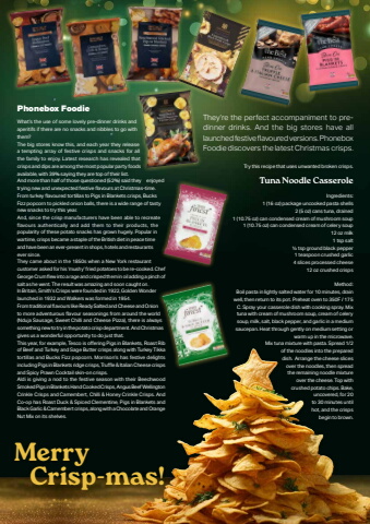 34 Phonebox Magazine | December 2025They%u2019re the perfect accompaniment to predinner drinks. And the big stores have all launched festive fl avoured versions. Phonebox Foodie discovers the latest Christmas crisps.Try this recipe that uses unwanted broken crisps.Tuna Noodle CasseroleIngredients:1 (16 oz) package uncooked pasta shells2 (5 oz) cans tuna, drained1 (10.75 oz) can condensed cream of mushroom soup1 (10.75 oz) can condensed cream of celery soup12 oz milk1 tsp salt%u00bc tsp ground black pepper1 teaspoon crushed garlic4 slices processed cheese12 oz crushed crispsMethod:Boil pasta in lightly salted water for 10 minutes, drain well, then return to its pot. Preheat oven to 350F / 175 C. Spray your casserole dish with cooking spray. Mix tuna with cream of mushroom soup, cream of celery soup, milk, salt, black pepper, and garlic in a medium saucepan. Heat through gently on medium setting or warm up in the microwave.Mix tuna mixture with pasta. Spread 1/2 of the noodles into the prepared dish. Arrange the cheese slices over the noodles, then spread the remaining noodle mixture over the cheese. Top with crushed potato chips. Bake, uncovered, for 20 to 30 minutes until hot, and the crisps begin to brown. What%u2019s the use of some lovely pre-dinner drinks and aperitifs if there are no snacks and nibbles to go with them?The big stores know this, and each year they release a tempting array of festive crisps and snacks for all the family to enjoy. Latest research has revealed that crisps and dips are among the most popular party foods available, with 39% saying they are top of their list. And more than half of those questioned (52%) said they enjoyed trying new and unexpected festive fl avours at Christmas-time. From turkey fl avoured tortillas to Pigs in Blankets crisps, Bucks Fizz popcorn to pickled onion balls, there is a wide range of tasty new snacks to try this year.And, since the crisp manufacturers have been able to recreate flavours authentically and add them to their products, the popularity of these potato snacks has grown hugely. Popular in wartime, crisps became a staple of the British diet in peace time and have been an ever-present in shops, hotels and restaurants ever since. They came about in the 1850s when a New York restaurant customer asked for his %u2018mushy%u2019 fried potatoes to be re-cooked. Chef George Crum fl ew into a rage and crisped them in oil adding a pinch of salt as he went. The result was amazing and soon caught on. In Britain, Smith%u2019s Crisps were founded in 1922, Golden Wonder launched in 1932 and Walkers was formed in 1954.From traditional fl avours like Ready Salted and Cheese and Onion to more adventurous fl avour seasonings from around the world (Nduja Sausage, Sweet Chilli and Cheese Pizza), there is always something new to try in the potato crisp department. And Christmas gives us a wonderful opportunity to do just that.This year, for example, Tesco is off ering Pigs in Blankets, Roast Rib of Beef and Turkey and Sage Butter crisps along with Turkey Tikka tortillas and Bucks Fizz popcorn. Morrison%u2019s has festive delights including Pigs in Blankets ridge crisps, Truffl e & Italian Cheese crisps and Spicy Prawn Cocktail skin-on crisps. Aldi is giving a nod to the festive season with their Beechwood Smoked Pigs in Blankets Hand Cooked Crisps, Angus Beef Wellington Crinkle Crisps and Camembert, Chilli & Honey Crinkle Crisps. And Co-op has Roast Duck & Spiced Clementine, Pigs in Blankets and Black Garlic & Camembert crisps, along with a Chocolate and Orange Nut Mix on its shelves.Phonebox FoodieMerry Crisp-mas!