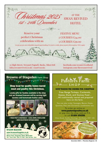 December 2025 | Phonebox Magazine 3501234 822330Browns of Stagsden Farm Shop%u2022 FRESH FRUIT & VEGETABLES %u2022 LOCAL BEERS, CIDER & WINE %u2022 WIDE SELECTION OF ARTISAN CHEESEwww.brownsofstagsden.co.ukFollow us on Facebook and Instagram for updatesManor Farm, Stagsden, Beds, MK43 8SHTue - Thurs 10am - 4pm, Fri 10am - 5pm, Sat 9am - 3pmShop local for quality home-reared meat and poultry this Christmas. Lovely gifts for foodies available in the shop and our licensed tearoom will be serving light lunches and homemade festive cakes.Pastures FarmSHOPNOW TAKING PRE ORDERS FOR CHRISTMASFree Range Turkeys, Cockerels, Geese, Duck, and Guinea Fowl......All traditionally reared and prepared here on the farm.You can also order Sausages, Bacon, Hams, Quiches, Pies and Christmas condiments too.To order go online atwww.pasturespoultry.co.ukor pop into the shop wed-sat 9-5, or call 01604 696586Christmas orders now being taken!Olney Road, Yardley Hastings, Nor thants, NN7 1HLe: james@pasturespoultry.co.ukChristmas 2025Reserve your perfect Christmas celebration with usSWAN REVIVED 1st - 24th December HOTEL33 High Street, Newport Pagnell, Bucks, Mk16 8ARinfo@swanrevived.co.uk | 01908 610565facebook.com/swanrevivedhotelinstagram.com/theswanrevivedFESTIVE MENU2 COURSES %u00a334.003 COURSES %u00a339.00%u00a315 per person non-refundable deposit upon booking. To reserve a table, please speak with reception. T&Cs apply.AT THE
