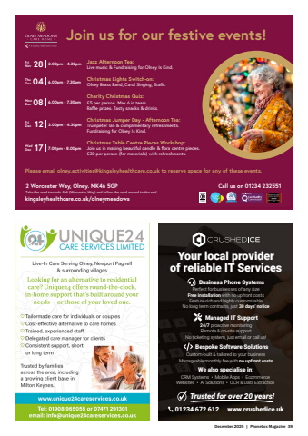 December 2025 | Phonebox Magazine 39Call us on 01234 232551%u0011kingsleyhealthcare.co.uk/olneymeadows%u00112 Worcester Way, Olney. MK46 5GPTake the road towards Aldi (Worcester Way) and follow the road around to the end.Join us for our festive events! Jazz Afternoon Tea: Live music & Fundraising for Olney Is Kind.Christmas Lights Switch-on:Olney Brass Band, Carol Singing, Stalls.Charity Christmas Quiz:%u00a35 per person. Max 6 in team. Raffle prizes. Tasty snacks & drinks.Christmas Jumper Day - Afternoon Tea:Trumpeter Ian & complimentary refreshments.Fundraising for Olney Is Kind.Christmas Table Centre Pieces Workshop:Join us in making beautiful candle & flora centre pieces.%u00a330 per person (for materials) with refreshments.FriNov 28 3.00pm - 4.30pm ThuDec 04 6.00pm - 7.30pm MonDec 08 6.00pm - 7.30pm FriDec 12 3.00pm - 4.30pm WedDec 17 7.00pm - 8.00pm Please email olney.activities@kingsleyhealthcare.co.uk to reserve space for any of these events.Your local providerof reliable IT ServicesWe also specialise in:CRM Systems %u2022 Mobile Apps %u2022 Ecommerce Websites %u2022 AI Solutions %u2022 OCR & Data Extraction 01234 672 612 www.crushedice.ukPerfect for businesses of any sizeFree installation with no upfront costsFeature-rich and highly customisableNo long term contracts, just 30 days' noticeManaged IT Support24/7 proactive monitoringRemote & on-site supportNo ticketing system, just email or call us!Business Phone SystemsBespoke Software SolutionsCustom-built & tailored to your businessManageable monthly fee with no upfront costsTrusted for over 20 years!