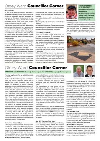 40 Phonebox Magazine | December 2025Planning Application for up to 200 houses in LavendonOn the 17th November a public consultation event was held at Lavendon Village Hall for residents so Colecar Strategic Land could explain their proposals to submit a planning application for up to 200 houses on land off Bedford Road. We have been aware for a few months that this application was coming and is due to be formally submitted in the new year. It is a site that is in the open countryside and is not included in the village%u2019s Neighbourhood Plan. Peter sought advice from planning offi cers who confi rmed that, as the site is in the open countryside and not included within any planning policies, it should normally be refused. The applicant is, however, entitled to submit the application, and residents should treat the application as any other planning application and comment on it in the usual way directly to planning offi cers after the application is submitted. While Keith sits on the Planning Committee, currently, so cannot express a view, Peter is completely opposed to this speculative and poorly thought through plan!Fire Service Proposed CutsFollowing on from last month, the proposal to undertake a public consultation on proposed cuts to the number of fi re engines (pumps) crewed by on-call fi refi ghters was approved at the Fire Authority meeting in mid-November. The consultation runs for 10 weeks, including the Christmas and New Year period. Keith proposed a 12-week period, which is the norm for consultations like this, but the Labour, Lib Dem and Independent councillors working in coalition rejected this proposal. What diff erence does an additional two weeks make?The consultation is now active on the Buckinghamshire Fire and Rescue service site; the link is: https://bucksfi re.gov.uk/oncallconsultation. The closing date for responses is 28th January 2026. Whilst the Olney station, crewed by our great on-call fi refi ghting team, is not under threat of losing its pump or closure. However, removing seven pumps from other stations may mean the Olney pump is deployed more often to provide resilience cover away from Olney.Peter and Keith do not want to see the removal of any on-call pumps as it reduces confi dence that adequate cover is in place across the whole of Buckinghamshire and Milton Keynes. In his capacity as a member of the Fire Authority, Keith has asked for an alternative proposal(s) to be tabled.New City Plan and a New TownThis past month has been a busy one for large future planning policies. Initially this has seen the fi nal stage of the Milton Keynes Local Plan, named the New City Plan, go out to consultation for the fi nal time. This is the plan that will take the city from now until 2050 and includes sites for around 60,000 new residential properties. The consultation ends on 22nd December. The main area that is aff ected will be a signifi cant expansion of the Milton Keynes East area that will encompass the village of Moulsoe and will extend to the Bedfordshire border, and most of the way up Chicheley Hill.In addition to this, we are still trying to get to grips with the impact of the New Town that the government is proposing in Milton Keynes. This will include around 40,000 more properties, but the location of many of these is not known yet.Peter and Keith both voted against a motion that welcomed the announcement of the New Town in Milton Keynes due to the sheer lack of detail about what is proposed. We will keep people informed as more information becomes available.Last article of 2025As this is the last article of 2025, we would like to wish all readers a very Happy Christmas and a peaceful New Year. If you have any problems that require urgent attention between Christmas and New Year, please do contact one of us by email or telephone, see below.Monthly Advice SurgeriesA reminder that our monthly advice surgeries are run in the Olney Centre on the fi rst Friday of each month between 7pm and 8pm %u2013appointments are not necessary. Alternatively, we can be contacted at other times by phone or email, our details are as follows:Olney Ward Councillor Corner CONTACT DEBBIE:Tel: 07494 681907 / debbie.whitworth@miltonkeynes.gov.ukMy Ward surgeries are every Tuesday, 10am-12pm at the Olney Centre. No need to book, just pop along.Cllr Debbie WhitworthOlney Ward Councillor CornerCllr Keith McLean Cllr Peter GearyCONTACT US: Keith: 07983 456081 keith.mclean@milton-keynes.gov.uk :: Peter: 07774 939404 peter.geary@milton-keynes.gov.ukDear residentsAs you are all aware, Stagecoach submitted a withdrawal notifi cation to end the 41 service at the end of November. We have negotiated an extension at Delegated Decisions, so we can (with the fi nancial support from C Beds and W Northants) procure a full route based on the existing commercial route (all agreed).The residents across the Olney ward all appreciate just how vital this service is, as a good many of you joined me in a long campaign fi ghting to keep this route running back in 2023, extending the service for Olney and Lavendon %u2013 and so naturally, on hearing of the withdrawal of service, I made absolutely sure your views and concerns were heard yet again.It is a necessity, especially for those in Olney and Lavendon, and of course all neighbouring villages, who are all relying totally on this route operating.Students, for their educational choices, and all those employed, getting to and from work.For hospital appointments and eye clinics, those of us visiting relatives in hospitals and shopping and meeting up with family and friends from neighbouring LAs.MKCC and neighbouring authorities have agreed there is a need initially for a one-year contract with provisions for extension, 1+1, subject to available funding from DFT. The Strategic Lead for Transport confi rmed one year funding +1+1 %u2013 so one year assured as funding jointly with neighbouring LAs is secure.After which, all being well, 1+1, but it will depend on 