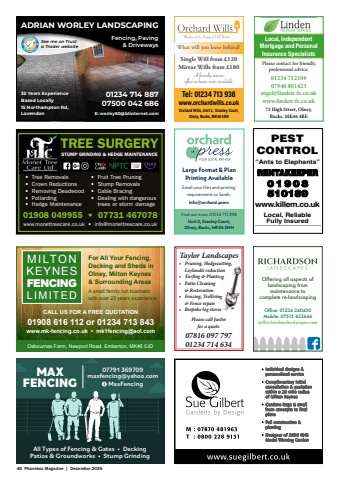 46 Phonebox Magazine | December 2025CALL US FOR A FREE QUOTATION 01908 616 112 or 01234 713 843 www.mk-fencing.co.uk %u2022 mk1fencing@aol.comMILTONKEYNESFENCINGLIMITEDOsbournes Farm, Newport Road, Emberton, MK46 5JDFor All Your Fencing, Decking and Sheds in Olney, Milton Keynes & Surrounding Areas A small family run business with over 25 years experienceAll Types of Fencing & Gates %u2022 DeckingPatios & Groundworks %u2022 Stump GrindingMAXFENCING07791 369709maxfencing@yahoo.com MaxFencing%u2022 Pruning, Hedgecutting, Leylandii reduction%u2022 Turfi ng & Planting%u2022 Patio Cleaning & Restoration%u2022 Fencing, Trellising & Fence repair%u2022 Bespoke log storesTaylor LandscapesPlease call Justin for a quote07816 097 79701234 714 634Leylandii reduction%u2022 Turfi ng & Planting%u2022 Fencing, Trellising TREE SURGERYSTUMP GRINDING & HEDGE MAINTENANCE01908 049955 %u2022 07731 467078www.monettreecare.co.uk %u2022 info@monettreecare.co.uk%u2022 Tree Removals%u2022 Crown Reductions%u2022 Removing Deadwood%u2022 Pollarding%u2022 Hedge Maintenance%u2022 Fruit Tree Pruning%u2022 Stump Removals%u2022 Cable Bracing%u2022 Dealing with dangeroustrees or storm damageOffering all aspects of landscaping from maintenance to complete re-landscapingOffice: 01234 240430 Mobile: 07515 632666sjr@richardsonlandscapes.comPESTCONTROL %u201cAnts to Elephants%u201dRENTAKEEPER01 90 8510189www.killem.co.ukLocal, ReliableFully InsuredADRIAN WORLEY LANDSCAPINGFencing, Paving & Driveways 01234 714 887 07500 042 686E: worley60@btinternet.com 35 Years Experience Based Locally15 Northampton Rd, LavendonSee me on Trust a Trader websiteFind out more: 01234 713 298 Unit 2, Stanley Court, Olney, Bucks, MK46 5NHLarge Format & Plan Printing AvailableEmail your fi les and printing requirements to Sarah:info@orchard.pressWhat will you leave behind?Single Will from %u00a3120Mirror Wills from %u00a3180 A friendly service, office or home visits availableTel: 01234 713 938www.orchardwills.co.ukOrchard Wills, Unit 2, Stanley Court, Olney, Bucks, MK46 5NH%u0009 %u00a0%u0009 %u00a0%u0009 %u00a0%u0009 %u00a0%u0009 %u00a0%u0009 %u00a0%u0009 %u00a0%u0009 %u00a0%u0009 %u00a0%u0009 %u00a0%u0009 %u00a0%u0009 %u00a0%u0009 %u00a0%u0009 %u00a0%u0009 %u00a0%u0009 %u00a0%u0009 %u00a0%u0009 %u00a0%u0009 %u00a0%u0009 %u00a0%u0009 %u00a0%u0009 %u00a0%u0009 %u00a0%u0009 %u00a0%u0009 %u00a0%u0009 %u00a0%u0009 %u00a0%u0009 %u00a0%u0009 %u00a0%u0009 %u00a0%u0009 %u00a0%u0009 %u00a0%u0009 %u00a0%u0009 %u00a0%u0009 %u00a0%u0009 %u00a0%u0009 %u00a0%u0009 %u00a0%u0009 %u00a0%u0009 %u00a0%u0009 %u00a0%u0009 %u00a0%u0009 %u00a0%u0009 %u00a0%u0009 %u00a0%u0009 %u00a0%u0009 %u00a0%u0009 %u00a0%u0009 %u00a0%u0009 %u00a0Homebuyer%u2019s, First Time Buyers anHomeownersWith mortgage rates at an all time low, now is the ideal timbuy your first home / next home. We offer a comprehenhomebuyer service to help guide you through the home bprocess.Existing borrowers could save money evermonth by changing to a more competitive deal. Why us find the mortgage that%u2019s right for you?In addition, we can help you protect your mortgage andependents in the event of redundancy, illness, injury and Contact us now for a free initial consultatio%u0009 %u00a0%u0009 %u00a0%u0009 %u00a0%u0009 %u00a0%u0009 %u00a0%u0009 %u00a0%u0009 %u00a0%u0009 %u00a0%u0009 %u00a0%u0009 %u00a0%u0009 %u00a0%u0009 %u00a0%u0009 %u00a0%u0009 %u00a0%u0009 %u00a0%u0009 %u00a0%u0009 %u00a0%u0009 %u00a0%u0009 %u00a0%u0009 %u00a0%u0009 %u00a0%u0009 %u00a0%u0009 %u00a0%u0009 %u00a0%u0009 %u00a0%u0009 %u00a0%u0009 %u00a0%u0009 %u00a0%u0009 %u00a0%u0009 %u00a0%u0009 %u00a0%u0009 %u00a0%u0009 %u00a0%u0009 %u00a0%u0009 %u00a0%u0009 %u00a0%u0009 %u00a0%u0009 %u00a0%u0009 %u00a0%u0009 %u00a0%u0009 %u00a0%u0009 %u00a0%u0009 %u00a0%u0009 %u00a0%u0009 %u00a0%u0009 %u00a0%u0009 %u00a0%u0009 %u00a0%u0009 %u00a0%u0009 %u00a001234 712109 / 07940 801423or email: nigel@linden-fs.co.ukwww.linden-fs.co.uk72 High Street, Olney, Bucks. MK46 4BEThe OLNEY Mortgage & Insurance SpecialiThink carefully before securing other debts against your home. Your home may be repossessed if you do not keep up repayments on your mortsubject to age, status and valuation. Ask for a personalised illustration. Please be advised that we charge a fee of %u00a3195 for our servic Please contact for friendly, professional advice.01234 712109 07940 801423nigel@linden-fs.co.ukwww.linden-fs.co.uk72 High Street, Olney, Bucks. MK46 4BELocal, Independent Mortgage and Personal Insurance Specialists