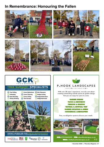 December 2025 | Phonebox Magazine 47MOB: 07931662355 | WEB: phooklandscapes.co.ukEMAIL: info@phooklandscapes.co.ukWith over 20 years%u2019 experience, we truly care about creating outstanding outside spaces & garden design that you can enjoy for years to come. Free, no-obligation quote to discuss your needs.%u2022GARDEN DESIGN%u2022PATIOS & DRIVEWAYS%u2022FENCING & DECKING%u2022NATURAL & ARTIFICAL TURF%u2022GARDEN BUILDINGS & SHEDS%u2022COMMERCIAL LANDSCAPINGTree Surgery SpecialistsWe provide professional tree care, landscaping and fencing services, in accordance with the rigorous standards laid out by the Arboricultural Association.For more information call: 01933 667575Email: enquiries@gcktreeworks.co.ukFREEquotes%u2022 Tree Felling%u2022 Pollarding%u2022 Dead Wooding%u2022 Stump Grinding%u2022 Crown Reductions%u2022 Crown Thinning%u2022 Crown Lifting%u2022 Tree Surveys%u2022 Site Clearence%u2022 Hedge Cutting%u2022 Hedge Reductions%u2022 Hedge RemovalsGCK Domestic leaflet A5.indd 1 14/08/2018 10:42TREE SURGERY SPECIALISTS www.gcktreeworks.co.ukTree FellingPollardingDead WoodingStump GrindingCrown ReductionsCrown ThinningCrown LiftingTree SurveysSite ClearanceHedge CuttingHedge ReductionsHedge RemovalsCONTACT US NOW FOR YOUR FREE NO OBLIGATION QUOTEt: 01933 667575 | e: enquiries@gcktreeworks.co.ukIn Remembrance: Honouring the Fallen