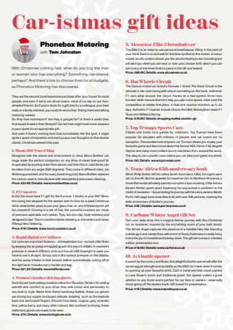 48 Phonebox Magazine | December 2025Phonebox Motoringwith Tom JohnstonWith Christmas coming fast, what do you buy the man or woman who has everything? Something car-related, perhaps? And there%u2019s lots to choose from for all budgets, as Phonebox Motoring has discovered.Car-istmas gift ideasThey are the second most expensive purchase after your house for most people, and even if we're not all car lovers, most of us rely on our fourwheeled friends. So if you're stuck for a gift idea for a colleague, your best mate or a family member, you could do worse than fi nding them something motoring-related.Do they love motorsport? Are they a gadget fan? Is there a useful item that would fi t well in their lifestyle? Our list here might hold some answers in your quest for an appropriate gift. And even if there%u2019s nothing here that immediately hits the spot, it might ignite a spark of inspiration and start up your own thoughts on that elusive classic Christmas present this year.1. Moon 360 Travel MugDesigned with the planet and environment in mind, Moon Bottles' car mugs make the perfect companion on any drive. A clever leak-proof lid is operated by pushing down from above, and then hot or cold drinks can be taken from any angle (360 degrees). They come in diff erent sizes, are lifetime guaranteed, and for every travel mug sold, Moon Bottles replaces the carbon used in manufacture with tree planting and ocean cleaning.Price: %u00a322.99 | Details: www.moonbottles.co.uk2. F1 CoastersIs this the must-have F1 gift for the Formula 1 fanatic in your life? When the racing has stopped for the season and it's time for a quiet Christmas drink, what better place to put your glass than on one of these stylish yet fun coasters? Coming in a set of fi ve, the colourful coasters are made of premium washable soft rubber. They are non-slip, heat-resistant and designed to last. There's excellent wheel detailing on the centre and raised 'Pitstop Hero' lettering.Price: %u00a318 | Details: www.iconiccoasters.co.uk3. Rapid digital tyre in%u0001 atorCar tyres are important features %u2013 and expensive too %u2013 so look after them by keeping the air pressure topped up with this electric infl ator. It measures pressure in several diff erent units and has an LED backlight in case you have to use it at night. Simply add in the correct pressure on the display, and the pump infl ates to that amount before automatically cutting off at the right level. Includes carry handle and bag.Price: %u00a331.20 | Details: www.halfords.com4. Women%u2019s leather driving glovesDent Gloves' best-selling model is called the Thruxton. Perfect for adding warmth and comfort to your drive, they add colour and personality to any look or style. Made from fi nest hairsheep leather, these car gloves are strong but supple and boast delicate detailing, such as the keyhole back and perforated fi ngers. Choose from black, cognac, grey, emerald, lime, yellow, berry and many other colours. Not confi ned to driving, these statement gloves are made to be seen.%u00a0Price: %u00a375 | Details: www.dentsgloves.com5. Alcosense Elite 3 breathalyserThe Elite 3 is an easy-to-use personal breathalyser, fi tting in the palm of your hand. Switch on and wait for the blow symbol on the screen. A colour coded results system shows you the alcohol level you are recording and will alert you when you are near or over your chosen limit, which you can set to any of the three limits in place in the UK and Ireland.Price: %u00a369.99 | Details: www.alcosense.co.uk6. Hot Wheels CircuitThe famous model car brand%u2019s Formula 1 Grand Prix Race Circuit is the ultimate in die-cast racing with actual overtaking on the track. Authentic F1 cars whip around the circuit thanks to a two-speed, three-lane booster while manual diverters help you gain extra speed, blaze past the competition or retake fi rst place. A dual lane counter monitors up to 25 laps. Authentic F1 liveries include Oracle Red Bull, MoneyGram Haas F1 Team and Williams Racing.Price: %u00a379.99 | Details: shopping.mattel.com/en-gb7. Top Trumps Sports CarsClassic and iconic card games for collectors, Top Trumps have been popular for decades with millions of people, and car lovers are no exception. This excellent set of sports car %u2018Trumps%u2019 allows you to play your favourite game and learn more about the Honda NSX, Ferrari F40, Bugatti Veyron and many more brilliant sports machines from around the world. The easy to carry plastic case means you can take your game anywhere.Price: %u00a36 | Details: www.toptrumps.com8. Trans Africa 65th anniversary bookWhen Philip Kohler left his native South Australia in 1955, his sights were set on the UK. But his appetite for travel led him to Northern Rhodesia, a move that would ultimately see him complete a solo crossing of the Sahara Desert. Kohler spent years traversing his way across a continent in the midst of revolution %u2013 documenting his journey with his Leica camera. Martin Port's 160-page book describes it all, with over 300 pictures, marking the 65th anniversary sf Kohler's journey.Price: %u00a335 | Details: www.porterpress.co.uk9. Carfume Winter Angel Gift SetTurn your daily drive into a magical festive journey with this Christmas car air freshener, inspired by the enchanting scent of your bath bomb. The Winter Angel captures the essence of a Yuletide fairy tale, blending bubble gum and candy fl oss with a hint of frosty freshness to really bring home the joy of snowfall and holiday cheer. The gift set comes in a limited edition presentation box.Price: %u00a316.95 | Details: www.carfume.co.uk10. 4x4 bottle openerInspired by the iconic Land Rover, this delightful bottle opener will off er the same rugged strength and durability as the 4WD car maker when it comes to opening up your favourite drink. Cast in metal and then hand-painted in Land Rover%u2019s iconic and traditional green, the opener makes a great addition to any home and is perfect for car fans or ow