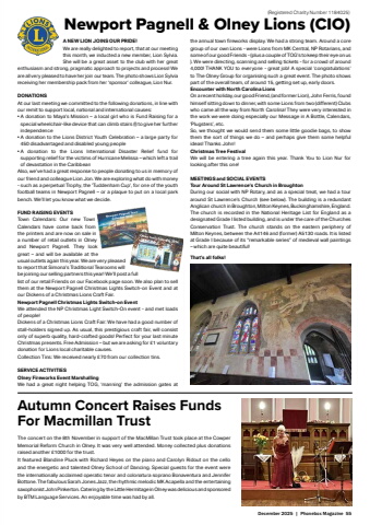 December 2025 | Phonebox Magazine 55A NEW LION JOINS OUR PRIDE!We are really delighted to report, that at our meeting this month, we inducted a new member, Lion Sylvia. She will be a great asset to the club with her great enthusiasm and strong, pragmatic approach to projects and process! We are all very pleased to have her join our team. The photo shows Lion Sylvia receiving her membership pack from her %u2018sponsor%u2019 colleague, Lion Nur.DONATIONSAt our last meeting we committed to the following donations, in line with our remit to support local, national and international causes:%u2022 A donation to Maya%u2019s Mission %u2013 a local girl who is Fund Raising for a special wheelchair-like device that can climb stairs (!) to give her further independence%u2022 A donation to the Lions District Youth Celebration %u2013 a large party for 450 disadvantaged and disabled young people%u2022 A donation to the Lions International Disaster Relief fund for supporting relief for the victims of Hurricane Melissa %u2013 which left a trail of devastation in the Caribbean Also, we%u2019ve had a great response to people donating to us in memory of our friend and colleague Lion Jon. We are exploring what do with money - such as a perpetual Trophy, the %u2018Tuddenham Cup%u2019, for one of the youth football teams in Newport Pagnell %u2013 or a plaque to put on a local park bench. We%u2019ll let you know what we decide.FUND RAISING EVENTSTown Calendars: Our new Town Calendars have come back from the printers and are now on sale in a number of retail outlets in Olney and Newport Pagnell. They look great %u2013 and will be available at the usual outlets again this year. We are very pleased to report that Simona%u2019s Traditional Tearooms will be joining our selling partners this year! We%u2019ll post a full list of our retail Friends on our Facebook page soon. We also plan to sell them at the Newport Pagnell Christmas Lights Switch-on Event and at our Dickens of a Christmas Lions Craft Fair.Newport Pagnell Christmas Lights Switch-on EventWe attended the NP Christmas Light Switch-On event - and met loads of people!Dickens of a Christmas Lions Craft Fair: We have had a good number of stall-holders signed up. As usual, this prestigious craft fair, will consist only of superb quality, hard-crafted goods! Perfect for your last minute Christmas presents. Free Admission %u2013 but we are asking for %u00a31 voluntary donation for Lions local charitable causes.Collection Tins: We received nearly %u00a370 from our collection tins.SERVICE ACTIVITIESOlney Fireworks Event MarshallingWe had a great night helping TOG, %u2018manning%u2019 the admission gates at Newport Pagnell & Olney Lions (CIO)the annual town fi reworks display. We had a strong team. Around a core group of our own Lions - were Lions from MK Central, NP Rotarians, and some of our good Friends - (plus a couple of TOG%u2019s to keep their eye on us ). We were directing, scanning and selling tickets - for a crowd of around 4,000! THANK YOU to everyone - great job! A special %u2018congratulations%u2019 to The Olney Group for organising such a great event. The photo shows part of the overall team, of around 15, getting set up, early doors.Encounter with North Carolina LionsOn a recent holiday, our good Friend, (and former Lion), John Ferris, found himself sitting down to dinner, with some Lions from two (diff erent) Clubs who came all the way from North Carolina! They were very interested in the work we were doing especially our Message in A Bottle, Calendars, %u2018Plugsters%u2019, etc.So, we thought we would send them some little goodie bags, to show them the sort of things we do %u2013 and perhaps give them some helpful ideas! Thanks John!Christmas Tree FestivalWe will be entering a tree again this year. Thank You to Lion Nur for looking after this one!MEETINGS and SOCIAL EVENTSTour Around St Lawrence%u2019s Church in BroughtonDuring our social with NP Rotary, and as a special treat, we had a tour around St Lawrence%u2019s Church (see below). The building is a redundant Anglican church in Broughton, Milton Keynes, Buckinghamshire, England. The church is recorded in the National Heritage List for England as a designated Grade I listed building, and is under the care of the Churches Conservation Trust. The church stands on the eastern periphery of Milton Keynes, between the A4146 and (former) A5130 roads. It is listed at Grade I because of its %u201cremarkable series%u201d of medieval wall paintings %u2013 which are quite beautiful! That%u2019s all folks!(Registered Charity Number 1184025)Autumn Concert Raises Funds For Macmillan Trust The concert on the 8th November in support of the MacMillan Trust took place at the Cowper Memorial Reform Church in Olney. It was very well attended. Money collected plus donations raised another %u00a31000 for the trust.It featured Blandine Pluck with Richard Heyes on the piano and Carolyn Ridout on the cello and the energetic and talented Olney School of Dancing. Special guests for the event were the internationally acclaimed operatic tenor and colonatura soprano Bonaventura and Jennifer Bottone. The fabulous Sarah Jones Jazz, the rhythmic melodic MK Acapella and the entertaining saxophonist John Pinkerton. Catering by the Little Hermitage in Olney was delicious and sponsored by BTM Language Services. An enjoyable time was had by all.