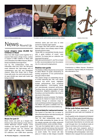 56 Phonebox Magazine | December 2025Local singers raise %u00a35,500 for Children in NeedMore than 300 singers came together for a surprise fl ash-mob in Kings Cross, London in support of BBC Children in Need, with choir attendees from Milton Keynes, Woburn Sands and Bedford amongst them. Led by The Collaboration Choir, the nationwide adult pop choir, the feel-good event delivered two high-energy sets of contemporary pop hits and reimagined classics, fi lling Coal Drops Yard in Kings Cross with music, fun, and community spirit. At least %u00a35,500 was raised with funds still being counted.Music for just %u00a31Music lovers can pick up a bargain this Dickens%u2019 Day while helping to keep Olney%u2019s United Reformed Church singing. Local residents and former professional opera singers Catriona and Tim German will once again be selling their remarkable CD collection, over 4,000 discs spanning classical, opera, jazz and rock, to raise money for ongoing organ repairs.The couple, who both perform with Welsh National Opera, have already raised %u00a31,000 through previous sales. %u201cOlney URC is a wonderfully friendly church with a great tradition of music,%u201d says Catriona. %u201cIt%u2019s lovely that our collection can help keep that going.%u201dWith discs priced at just %u00a31, and Tim on hand to off er recommendations from his eclectic mix, it%u2019s a sale worth singing about.Stables new guideThe Stables in Milton Keynes has announced its latest What%u2019s On guide, showcasing an exciting programme of live performances through to March 2026.This season brings an outstanding line-up of artists spanning jazz, folk, rock, blues, classical and world music. Highlights include performances from acclaimed singer-songwriters, chart-topping bands and internationally renowned performers. Touching, funny and utterly original, Freckle Productions%u2019 delightful adaptation of Julia Donaldson and Axel Scheffl er%u2019s Stick Man is also back in December.Alongside its concert schedule, The Stables continues its mission to inspire and nurture creativity through an extensive range of music workshops and learning opportunities. The What%u2019s On guide is available from The Stables Box Offi ce and at www.stables.org.Funeral date for restaurant ownerThe funeral of Tom Bent, the co-owner of Olney Pancake Parlour who died recently, will take place on 4th December.Tom, 33, died unexpectedly early last month while renovating his house. He ran the popular pancake and coff ee restaurant along with brothers Jamie and Marc Sharp. %u201cTom was the brightest light in every room and had a warmth and humour that touched everyone he met,%u201d said the Pancake Parlour on social media. The funeral will take place at 11.30am at Oak Chapel, Crownhill News Round UpPubs of Olney available now Tom Bent, centre, with brothers Jamie and Marc Sharp Stables Stick Man Liddy%u2019s painting of a peacock in watercolourChristmas Tree Festival at Olney ChurchCrematorium in Milton Keynes. Donations are invited for Thames Valley Air Ambulance who attended to Tom.Writer pub-lishes own bookAn Olney man has published a book describing the past pubs and hostelries of the town. Lloyd Lugsden wrote, designed and released the %u2018Pubs of Olney%u2019 guide himself following a love of the town and its history, in particular its past pubs. Described as %u2018an armchair pub crawl through time%u2019, the handbook looks at Olney%u2019s rich history of inns and taverns.%u201cThe book came from research, which is part of the fun, followed by documenting the buildings with photography,%u201d said Lloyd. %u201cAdded to this I enjoyed the local anecdotes