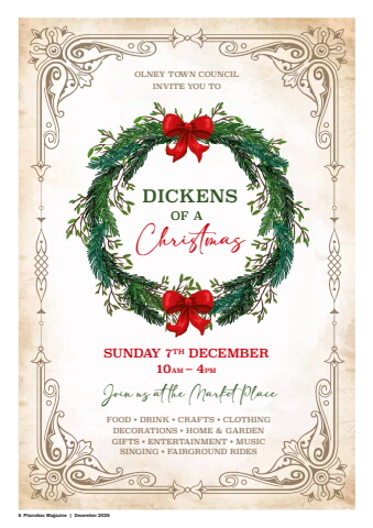 6 Phonebox Magazine | December 2025OLNEY TOWN COUNCIL INVITE YOU TODICKENSChrist masSUNDAY 7TH DECEMBER10AM %u2013 4PMJoin us at th e Market PlaceFOOD %u2022 DRINK %u2022 CRAFTS %u2022 CLOTHINGDECORATIONS %u2022 HOME & GARDENGIFTS %u2022 ENTERTAINMENT %u2022 MUSICSINGING %u2022 FAIRGROUND RIDES