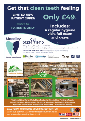 December 2025 | Phonebox Magazine 79 High Street, Olney, Bucks MK46 4EBemail: moodleydentalpractice@gmail.com www.moodleydentalpractice.co.ukDr VEGAN K MOODLEY BDS(SA) IQE(UK) Dip Implant Dent RCS(Eng) GDC Reg No: 101543 %u2022 Implant and cosmetic dentistGet that clean teeth feelingCall 01234 711410LIMITED NEW PATIENT OFFERIncludes:A regular hygiene visit, full exam and x-raysOnly %u00a349**T&Cs applyFIRST 50 PATIENTS ONLYSTONE WALL CONSTRUCTION SPECIALISTS BASED IN MILTON KEYNESTraditional Lime Mortar Work, Stone Restoraton Repair, Lime Pointing & Repair,Home Extensions & Renovations, Structural Alterations, Bricklaying & Stonework Specialist, Garden Walls, Landscaping and Paving, Carpentry and PaintingCALL TODAY TO DISCUSS YOUR PROJECT WITH US call: 01908 395004 email: info@mbpconstruction.co.ukvisit: www.mbpconstruction.co.uk