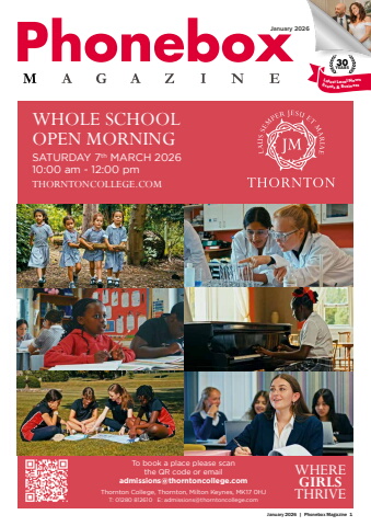 January 2026 | Phonebox Magazine 130YEARSLatest Local News Events & BusinessJanuary 2026WHOLE SCHOOLOPEN MORNINGSATURDAY 7th MARCH 202610:00 am - 12:00 pmTHORNTONCOLLEGE.COMTo book a place please scanthe QR code or emailadmissions@thorntoncollege.comWHEREGIRLSTHRIVE Thornton College, Thornton, Milton Keynes, MK17 0HJT: 01280 812610 E: admissions@thorntoncollege.com