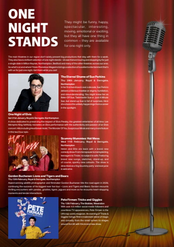 14 Phonebox Magazine | January 2026The main theatres in our region don%u2019t solely present big productions that stay with them for a week. They also have a brilliant selection of one night stands %u2013 shows that are touring and stopping by for just a single date in Milton Keynes, Northampton, Bedford and many of the other theatres across our area.So what%u2019s on and where? Here Phonebox Magazine brings a selection of excellent entertainment that%u2019s with us for just one night. Get them while you can!The Eternal Shame of Sue PerkinsThu 29th January, Royal & Derngate, NorthamptonIn her first live show in over a decade, Sue Perkins delivers a hilarious treatise on stigma, humiliation, and misunderstanding. You might know her as Bake-Off Sue, Taskmaster Sue or Just A Minute Sue, but stand-up Sue is full of surprises. Here she shares the unlikely happenings from a career in the spotlight.One Night of ElvisSat 31st January, Royal & Derngate, NorthamptonA show dedicated to preserving the respect of Elvis Presley, the greatest entertainer of all time. Lee Memphis King faithfully recreates an Elvis performance with the authenticity and passion of an Elvis concert. Hits including Heartbreak Hotel, The Wonder Of You, Suspicious Minds and many more feature in this two hour epic.Scummy Mummies: Hot MessWed 11th February, Royal & Derngate, NorthamptonHelen and Ellie are back with a brand new comedy show. From menopause to mansplaining, teenagers to Tinder, no subject is safe. Featuring brand new songs, sketches, stand-up, and of course, sparkly new catsuits. The show is described as a %u2018big Scummy party%u2019 and everyone is welcome.Gordon Buchanan: Lions and Tigers and BearsThu 12th February, Royal & Derngate, NorthamptonAward winning wildlife photographer and filmmaker Gordon Buchanan hits the road again in 2026, continuing the success of his biggest ever live tour %u2013 Lions and Tigers and Bears. Gordon recounts thrilling encounters with pandas, grizzlies, tigers, jaguars and more as he recounts heart-stopping moments and tender interactions.Pete Firman: Tricks and GigglesThu 12th February, The Stables, WavendonWith over 4.5 million social media followers and countless TV appearances, Pete Firman is the UK's top comic magician. An evening of 'Tricks & Giggles' brings Pete%u2019s trademark blend of magic and comedy from the small screen to stages around the UK with this brand-new show. ONE NIGHT STANDSThey might be funny, happy, spectacular, interesting, moving, emotional or exciting, but they all have one thing in common %u2013 they are available for one night only.