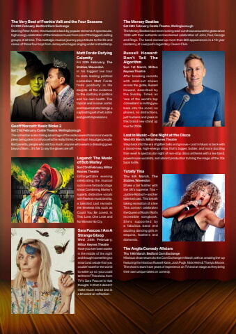 January 2026 | Phonebox Magazine 15The Very Best of Frankie Valli and the Four SeasonsFri 20th February, Bedford Corn ExchangeStarring Peter Andre, this musical is back by popular demand. A spectacular, high energy celebration of the timeless music from one of the biggest-selling groups of all time. This nostalgic musical journey pays tribute to the life and career of those four boys from Jersey who began singing under a streetlamp.Matt Forde: Defying CalamityFri 20th February, The Stables, WavendonIn his biggest live tour to date leading political comedian Matt Forde finds positivity in life despite all the evidence to the contrary in politics and his own health. The topical and incisve comic and impersonator brings a captivating set of wit, satire and great impressions.Geoff Norcott: Basic Bloke 2Sat 21st February, Castle Theatre, WellingboroughThe comedian is also taking advantage of the rediscovered tolerance towards jokes being jokes to tell you what he really thinks. How much he judges people. Bad parents, people who eat too much, anyone who wears a dressing gown beyond 9am%u2026 it%u2019s fair to say the gloves are off. Legend: The Music of Bob MarleySun 22nd February, Milton Keynes TheatreUnforgettable evening celebrating the musical icon in one fantastic stage show. Combining Marley%u2019s superb, distinctive vocals with flawless musicianship, a talented cast recreate the timeless hits such as Could You Be Loved, Is This Love, One Love and No Woman No Cry.Sara Pascoe: I Am A Strange GloopWed 25th February, Milton Keynes TheatreHave you ever been awake in the middle of the night and thought something so smart and astute that you couldn%u2019t wait for the world to wake up so you could tell them? This show, from TV%u2019s Sara Pascoe is that thought. In that it doesn%u2019t make much sense and is a bit weird on reflection.The Mersey BeatlesSat 28th February, Castle Theatre, WellingboroughThe Mersey Beatles have been rocking sold-out shows around the globe since 1999 with their authentic and acclaimed celebration of John, Paul, George and Ringo. The band clocked up more than 600 appearances in a 10-year residency at Liverpool%u2019s legendary Cavern Club.Russell Howard: Don%u2019t Tell The AlgorithmSun 1st March, Milton Keynes TheatreAfter breaking records with sold-out shows across the globe, Russell Howard, described by the Sunday Times as %u2018one of the world%u2019s top comedians%u2019 is inviting you back into the room: no phones, no distractions, just humans and jokes in this brand new stand up tour for 2026.Lost in Music %u2013 One Night at the DiscoWed 4th March, Milton Keynes TheatreStep back into the era of glitter balls and groove %u2013 Lost in Music is back with a brand-new, high-energy show that%u2019s bigger, bolder, and more dazzling than ever! A spectacular night of non-stop disco anthems with a live band, powerhouse vocalists, and vibrant production to bring the magic of the 70s back to life. Totally TinaThu 5th March, The Stables, WavendonShake a tail feather with the UK%u2019s supreme Tina %u2013 Justine Riddoch %u2013 and her talented cast. This breath taking recreation of a live Tina concert celebrates the Queen of Rock%u2019n%u2019Roll%u2019s incredible songbook. She%u2019s supported by a fabulous band and dazzling dancing girls in sequins, feathers and diamonds.The Anglia Comedy AllstarsThu 19th March, Bedford Corn ExchangeHilarious show returns to the Corn Exchange in March, with an amazing line-up featuring the hilarious Russell Kane, Josh Pugh, Nick Helm & Thanyia Moore. The show%u2019s stars have years of experience on TV and on stage as they bring their own unique takes on comedy.