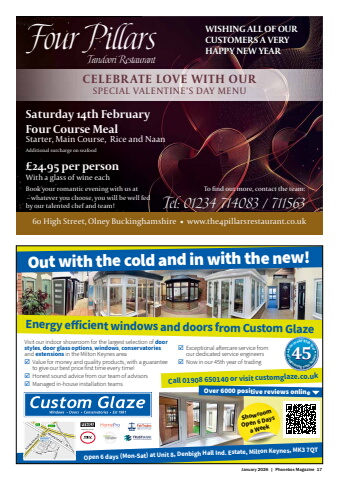 January 2026 | Phonebox Magazine 17Registered CompanyOpen 6 days (Mon-Sat) at Unit 8, Denbigh Hall Ind. Estate, Milton Keynes, MK3 7QTDenbigh Hall Drive Denbigh Hall DriveWatling Street V4Standing Way H8 A421 A5Denbigh Hall Denbigh HallWhaddon WayOver 6000 positive reviews online ShowroomOpen 6 Days a WeekOut with the cold and in with the new!Energy e%u0082 icient windows and doors from Custom GlazeNowinour45thYearof improving your home45 sCall 01908 650140 or visit customglaze.co.ukVisit our indoor showroom for the largest selection of door styles, door glass options, windows, conservatoriesand extensions in the Milton Keynes area%uf0fe Value for money and quality products, with a guarantee to give our best price first time every time!%uf0fe Honest sound advice from our team of advisors %uf0fe Managed in-house installation teams %uf0fe Exceptional a%u0081 ercare service from our dedicated service engineers%uf0fe Now in our 45th year of tradingSaturday 14th FebruaryFour Course Meal Starter, Main Course, Rice and NaanAdditional surcharge on seafood%u00a324.95 per personWith a glass of wine eachBook your romantic evening with us at %u2013 whatever you choose, you will be well fedby our talented chef and team!CELEBR ATE LOVE WITH OUR SPECIAL VALENTINE%u2019S DAY MENU60 High Street, Olney Buckinghamshire %u2022 www.the4pillarsrestaurant.co.ukTandoo%u001a RestaurantFour PillarsTel: 01234 714083 / 711563To fi nd out more, contact the team:WISHING ALL OF OUR CUSTOMERS A VERY HAPPY NEW YEARWISHING ALL OF OUR CUSTOMERS A VERY