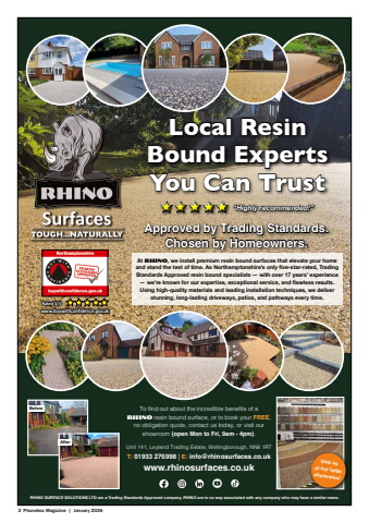 2 Phonebox Magazine | January 2026RHINO SURFACE SOLUTIONS LTD are a Trading Standards Approved company. RHINO are in no way associated with any company who may have a similar name.To find out about the incredible benefits of a Rhino resin bound surface, or to book your FREE, no obligation quote, contact us today, or visit our showroom (open Mon to Fri, 9am - 4pm).Unit 141, Leyland Trading Estate, Wellingborough, NN8 1RT T: 01933 276998 | E: info@rhinosurfaces.co.uk www.rhinosurfaces.co.ukRated 5/5www.buywithconfidence.gov.ukBeforeAfterLocal Resin Bound Experts You Can Trust%u201cHighly recommended!%u201dApproved by Trading Standards. Chosen by Homeowners.At Rhino, we install premium resin bound surfaces that elevate your home and stand the test of time. As Northamptonshire%u2019s only five-star-rated, Trading Standards Approved resin bound specialists %u2014 with over 17 years%u2019 experience %u2014 we%u2019re known for our expertise, exceptional service, and flawless results. Using high-quality materials and leading installation techniques, we deliver stunning, long-lasting driveways, patios, and pathways every time.Visit us at our large showroom!