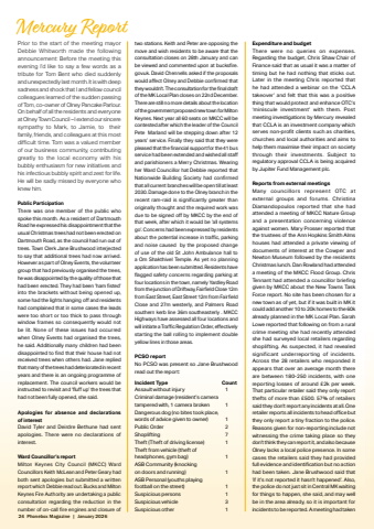 24 Phonebox Magazine | January 2026Mercury ReportPrior to the start of the meeting mayor Debbie Whitworth made the following announcement: Before the meeting this evening I%u2019d like to say a few words as a tribute for Tom Bent who died suddenly and unexpectedly last month. It is with deep sadness and shock that I and fellow council colleagues learned of the sudden passing of Tom, co-owner of Olney Pancake Parlour. On behalf of all the residents and everyone at Olney Town Council %u2013 I extend our sincere sympathy to Mark, to Jamie, to their family, friends, and colleagues at this most diffi cult time. Tom was a valued member of our business community, contributing greatly to the local economy with his bubbly enthusiasm for new initiatives and his infectious bubbly spirit and zest for life. He will be sadly missed by everyone who knew him.Public ParticipationThere was one member of the public who spoke this month. As a resident of Dartmouth Road he expressed his disappointment that the usual Christmas trees had not been erected on Dartmouth Road, as the council had run out of trees. Town Clerk Jane Brushwood interjected to say that additional trees had now arrived. However as part of Olney Events, the volunteer group that had previously organised the trees, he was disappointed by the quality of those that had been erected. They had been %u2018ham fi sted%u2019 into the brackets without being opened up, some had the lights hanging off and residents had complained that in some cases the leads were too short or too thick to pass through window frames so consequently would not be lit. None of these issues had occurred when Olney Events had organised the trees, he said. Additionally many children had been disappointed to fi nd that their house had not received trees when others had. Jane replied that many of the trees had deteriorated in recent years and there is an ongoing programme of replacement. The council workers would be instructed to revisit and %u2018fl uff up%u2019 the trees that had not been fully opened, she said.Apologies for absence and declarations of interestDavid Tyler and Deirdre Bethune had sent apologies. There were no declarations of interest.Ward Councillor%u2019s reportMilton Keynes City Council (MKCC) Ward Councillors Keith McLean and Peter Geary had both sent apologies but submitted a written report which Debbie read out. Bucks and Milton Keynes Fire Authority are undertaking a public consultation regarding the reduction in the number of on-call fi re engines and closure of two stations. Keith and Peter are opposing the move and wish residents to be aware that the consultation closes on 28th January and can be viewed and commented upon at bucksfi re.gov.uk. David Chennells asked if the proposals would aff ect Olney and Debbie confi rmed that they wouldn%u2019t. The consultation for the fi nal draft of the MK Local Plan closes on 22nd December. There are still no more details about the location of the government proposed new town for Milton Keynes. Next year all 60 seats on MKCC will be contested after which the leader of the Council Pete Marland will be stepping down after 12 years%u2019 service. Finally they said that they were pleased that the fi nancial support for the 41 bus service had been extended and wished all staff and parishioners a Merry Christmas. Wearing her Ward Councillor hat Debbie reported that Nationwide Building Society had confirmed that all current branches will be open till at least 2030. Damage done to the Olney branch in the recent ram-raid is significantly greater than originally thought and the required work was due to be signed off by MKCC by the end of that week, after which it would be %u2019all systems go%u2019. Concerns had been expressed by residents about the potential increase in traffi c, parking and noise caused by the proposed change of use of the old St John Ambulance hall to a Om Shakthivel Temple. As yet no planning application has been submitted. Residents have fl agged safety concerns regarding parking at four locations in the town, namely Yardley Road from the junction of Driftway, Fairfi eld Close 12m from East Street, East Street 12m from Fairfi eld Close and 27m westerly, and Palmers Road southern kerb line 36m southeasterly . MKCC Highways have assessed all four locations and will initiate a Traffi c Regulation Order, eff ectively starting the ball rolling to implement double yellow lines in those areas.PCSO reportNo PCSO was present so Jane Brushwood read out the report:Incident Type CountAssault without injury 1Criminal damage (resident%u2019s camera tampered with, 1 camera broken 1Dangerous dog (no bites took place, words of advice given to owner) 1Public Order 2Shoplifting 7Theft (Theft of driving license) 1Theft from vehicle (theft of headphones, gym bag) 1ASB Community (knocking on doors and running) 1ASB Personal (youths playing football on the street) 1Suspicious persons 1Suspicious vehicle 3Suspicious other 1Expenditure and budgetThere were no queries on expenses. Regarding the budget, Chris Shaw Chair of Finance said that as usual it was a matter of timing but he had nothing that sticks out. Later in the meeting Chris reported that he had attended a webinar on the %u2018CCLA takeover%u2019 and felt that this was a positive thing that would protect and enhance OTC%u2019s %u2018miniscule investment%u2019 with them. Post meeting investigations by Mercury revealed that CCLA is an investment company which serves non-profi t clients such as charities, churches and local authorities and aims to help them maximise their impact on society through their investments. Subject to regulatory approval CCLA is being acquired by Jupiter Fund Management plc.Reports from external meetingsMany councillors represent OTC at external groups and forums. Christina Diamandopoulos reported that she had attended a meeting of MKCC Nature Group and a presentation concerning violence against women. Mary Prosser reported that the trustees
