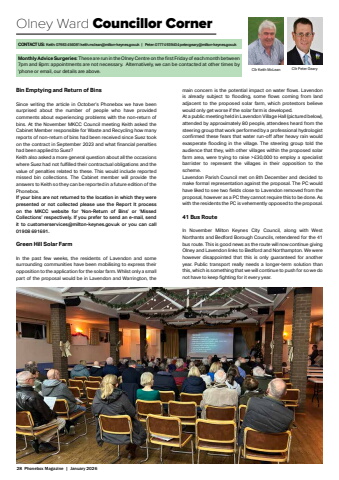 28 Phonebox Magazine | January 2026Olney Ward Councillor CornerCllr Keith McLean Cllr Peter GearyCONTACT US: Keith: 07983 456081 keith.mclean@milton-keynes.gov.uk | Peter: 07774 939404 peter.geary@milton-keynes.gov.ukBin Emptying and Return of BinsSince writing the article in October%u2019s Phonebox we have been surprised about the number of people who have provided comments about experiencing problems with the non-return of bins. At the November MKCC Council meeting Keith asked the Cabinet Member responsible for Waste and Recycling how many reports of non-return of bins had been received since Suez took on the contract in September 2023 and what financial penalties had been applied to Suez? Keith also asked a more general question about all the occasions where Suez had not fulfilled their contractual obligations and the value of penalties related to these. This would include reported missed bin collections. The Cabinet member will provide the answers to Keith so they can be reported in a future edition of the Phonebox.If your bins are not returned to the location in which they were presented or not collected please use the Report It process on the MKCC website for %u2018Non-Return of Bins%u2019 or %u2018Missed Collections%u2019 respectively. If you prefer to send an e-mail, send it to customerservices@milton-keynes.gov.uk or you can call 01908 691691.Green Hill Solar FarmIn the past few weeks, the residents of Lavendon and some surrounding communities have been mobilising to express their opposition to the application for the solar farm. Whilst only a small part of the proposal would be in Lavendon and Warrington, the main concern is the potential impact on water flows. Lavendon is already subject to flooding, some flows coming from land adjacent to the proposed solar farm, which protestors believe would only get worse if the solar farm is developed.At a public meeting held in Lavendon Village Hall (pictured below), attended by approximately 80 people, attendees heard from the steering group that work performed by a professional hydrologist confirmed these fears that water run-off after heavy rain would exasperate flooding in the village. The steering group told the audience that they, with other villages within the proposed solar farm area, were trying to raise >%u00a330,000 to employ a specialist barrister to represent the villages in their opposition to the scheme.Lavendon Parish Council met on 8th December and decided to make formal representation against the proposal. The PC would have liked to see two fields close to Lavendon removed from the proposal, however as a PC they cannot require this to be done. As with the residents the PC is vehemently opposed to the proposal.41 Bus RouteIn November Milton Keynes City Council, along with West Northants and Bedford Borough Councils, retendered for the 41 bus route. This is good news as the route will now continue giving Olney and Lavendon links to Bedford and Northampton. We were however disappointed that this is only guaranteed for another year. Public transport really needs a longer-term solution than this, which is something that we will continue to push for so we do not have to keep fighting for it every year.Monthly Advice Surgeries: These are run in the Olney Centre on the first Friday of each month between 7pm and 8pm: appointments are not necessary. Alternatively, we can be contacted at other times by %u2018phone or email, our details are above.