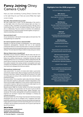 30 Phonebox Magazine | January 2026Have you been wondering if joining Olney%u2019s Camera Club is the right thing for you? Here are some FAQs that might come in handy.How often, when and where do you meet?We meet roughly twice a month. The last Wednesday of the month is our Club Night, held at the Olney Centre between 8pm and 10pm. It is a mixture of talks, competitions and practical sessions. We also have a social evening, often in a pub, and always ending at the pub. These are also on a Wednesday. They are a mixture of activities, from walkabouts, to project sharing, to watching YouTube tutorials together, and give us achance to share ideas and our photos.How much does it cost?Annual membership is %u00a320 and the formal nights are %u00a35 each time. The social gatherings are usually FOC.Do I need an expensive camera or advanced skills?Defi nitely not. We have all levels of photographer, from virtual novices, smartphone photographers, improvers and one or two seasoned professionals. Most of us when we joined used our cameras on automatic (and still do quite a lot), but are aspiring to take more control of the cameras settings. The most important thing is a desire to enjoy using your camera.What am I likely to learn or benefi t from?Impossible to say as everyone is diff erent. But the club%u2019s main aim is to get you thinking about the end result more. For you that might mean being more creative; improving your composition; learning the camera settings; getting out of a rut; or honing your skills for seeing the photo. We would hope you would see improvement through feedback and practice; fi nd creative inspiration from seeing member%u2019s and speakers work; gain confi dence; be motivated to shoot more often and fi nally simply to meet new friends and colleagues that share your passion.What would your members say?Helen (joined 2021) %u201cI%u2019ve learnt a lot about what makes a good photo over the last couple of years. Now I%u2019m hoping to put this into practice by learning to slow down. Instead of taking 200 hurried photos in the hope one will be good, I%u2019m trying to take a handful with clear intention before pressing the shutter.%u201dBob (joined 2023) %u201cI fi nd competition nights really informative. Although I don%u2019t enter them myself yet, seeing other members interpretation of the theme and the judges suggestions of how a photo could be improved by some judicial cropping or light post processing has really taught me a lot and made me think a lot more about composition.%u201dMaureen (joined 1998) %u201cAs a founder member of the Club it has provided endless challenges and opportunities over the years to get out with the camera having fun with like-minded people, getting inspiration from everybody. The monthly meetings/talks and quarterly competitions help beginners and %u2018old timer%u2019s%u2019 improve their knowledge in a friendly and enjoyable atmosphere.%u201dNick (joined 2024) %u201cOne of the things I have learned is that those amazing photographs that you see on instagram and in magazines have been polished by subtle post-processing. Learning a few simple techniques has hugely upped my end game and more importantly given me so much more confi dence. Not all members post-process, but it%u2019s good to get help and tips off those that do.%u201dFancy Joining Olney Camera Club? Highlights from the 2026 programmeTALKS BY EXTERNAL PRESENTERS28th January: Smart Phone PhotographyHow to get the most out of the camera onyour phone25th February:Through My Viewfi nderThis talk is about how the perfectly timedshot can bring a photograph to life.Examples, tips & techniques.29th April: Land, Sea & AirA portfolio talk showcasing landscape,seascape and drone photography.25th November: Essential Camera SkillsInteractive practical sessionPROJECTS & ACTIVITIESOpportunities to get out & about withyour camera and then share the results.18th February:Portrait Chain20th May: 1 Subject, 10 photos17th June: Scavenger Hunt15th July: Dan Evans Photo Walk16th September: Alphabetti SpaghettiCOMPETITION THEMESWe run competitions every third month,with an expert, external judge pickingour winners.These are the themes for 2026Looking Down | Urban | Opposites | HighContrast | Seascapes | Shadows &Silhouettes | Fungus | Winter | Open x 4 |Monochrome | LandscapesGet in Touch:Email: programme.occ@gmail.comFacebook: olney camera clubWebsite: www.olneycameraclub.co.ukMaureen Smith: Farming