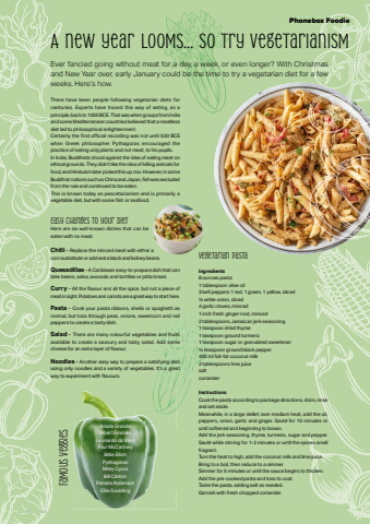 34 Phonebox Magazine | January 2026Phonebox FoodieEver fancied going without meat for a day, a week, or even longer? With Christmas and New Year over, early January could be the time to try a vegetarian diet for a few weeks. Here%u2019s how.There have been people following vegetarian diets for centuries. Experts have traced this way of eating, as a principle, back to 1000 BCE. That was when groups from India and some Mediterranean countries believed that a meatless diet led to philosophical enlightenment. Certainly the fi rst offi cial recording was not until 530 BCE when Greek philosopher Pythagoras encouraged the practice of eating only plants and not meat, to his pupils. In India, Buddhists stood against the idea of eating meat on ethical grounds. They didn%u2019t like the idea of killing animals for food, and Hinduism later picked this up, too. However, in some Buddhist nations such as China and Japan, fi sh was excluded from the rule and continued to be eaten. This is known today as pescetarianism and is primarily a vegetable diet, but with some fi sh or seafood.Easy changes to your dietHere are six well-known dishes that can be eaten with no meat:Chilli %u2013 Replace the minced meat with either a corn substitute or add extra black and kidney beans.Quesadillas %u2013 A Caribbean easy-to-prepare dish that can take beans, salsa, avocado and tortillas or pitta bread.Curry %u2013 All the fl avour and all the spice, but not a piece of meat in sight. Potatoes and carrots are a great way to start here.Pasta %u2013 Cook your pasta ribbons, shells or spaghetti as normal, but toss through peas, onions, sweetcorn and red peppers to create a tasty dish.Salad %u2013 There are many colourful vegetables and fruits available to create a savoury and tasty salad. Add some cheese for an extra layer of fl avour.Noodles %u2013 Another easy way to prepare a satisfying dish using only noodles and a variety of vegetables. It%u2019s a great way to experiment with fl avours.A new year looms%u2026 so try vegetarianismVegetarian pastaIngredients8 ounces pasta 1 tablespoon olive oil3 bell peppers 1 red, 1 green, 1 yellow, sliced %u00bd white onion, diced4 garlic cloves, minced1 inch fresh ginger root, minced2 tablespoons Jamaican jerk seasoning1 teaspoon dried thyme1 teaspoon ground turmeric1 teaspoon sugar or granulated sweetener%u00bd teaspoon ground black pepper400 ml full-fat coconut milk2 tablespoons lime juicesaltcorianderInstructionsCook the pasta according to package directions, drain, rinse and set aside.Meanwhile, in a large skillet over medium heat, add the oil, peppers, onion, garlic and ginger. Saut%u00e9 for 10 minutes or until softened and beginning to brown.Add the jerk seasoning, thyme, turmeric, sugar and pepper. Saut%u00e9 while stirring for 1-2 minutes or until the spices smell fragrant.Turn the heat to high, add the coconut milk and lime juice. Bring to a boil, then reduce to a simmer. Simmer for 5 minutes or until the sauce begins to thicken.Add the pre-cooked pasta and toss to coat.Taste the pasta, adding salt as needed.Garnish with fresh chopped coriander.Ariana Grande Albert Einstein Leonardo da Vinci Paul McCartney Billie Eilish Pythagoras Miley Cyrus Bill Clinton Pamela Anderson Ellie GouldingFamous veggies