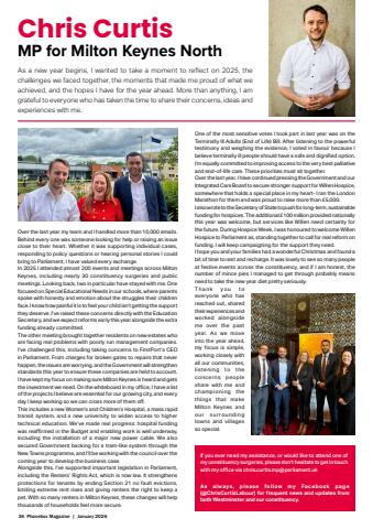 36 Phonebox Magazine | January 2026As a new year begins, I wanted to take a moment to refl ect on 2025, the challenges we faced together, the moments that made me proud of what we achieved, and the hopes I have for the year ahead. More than anything, I am grateful to everyone who has taken the time to share their concerns, ideas and experiences with me. Over the last year my team and I handled more than 10,000 emails. Behind every one was someone looking for help or raising an issue close to their heart. Whether it was supporting individual cases, responding to policy questions or hearing personal stories I could bring to Parliament, I have valued every exchange. In 2025 I attended almost 200 events and meetings across Milton Keynes, including nearly 30 constituency surgeries and public meetings. Looking back, two in particular have stayed with me. One focused on Special Educational Needs in our schools, where parents spoke with honesty and emotion about the struggles their children face. I know how painful it is to feel your child isn%u2019t getting the support they deserve. I%u2019ve raised these concerns directly with the Education Secretary, and we expect reforms early this year alongside the extra funding already committed.The other meeting brought together residents on new estates who are facing real problems with poorly run management companies. I%u2019ve challenged this, including taking concerns to FirstPort%u2019s CEO in Parliament. From charges for broken gates to repairs that never happen, the issues are worrying, and the Government will strengthen standards this year to ensure these companies are held to account.I have kept my focus on making sure Milton Keynes is heard and gets the investment we need. On the whiteboard in my offi ce, I have a list of the projects I believe are essential for our growing city, and every day I keep working so we can cross more of them off .This includes a new Women%u2019s and Children%u2019s Hospital, a mass rapid transit system, and a new university to widen access to higher technical education. We%u2019ve made real progress: hospital funding was reaffi rmed in the Budget and enabling work is well underway, including the installation of a major new power cable. We also secured Government backing for a tram-like system through the New Towns programme, and I%u2019ll be working with the council over the coming year to develop the business case.Alongside this, I%u2019ve supported important legislation in Parliament, including the Renters%u2019 Rights Act, which is now law. It strengthens protections for tenants by ending Section 21 no fault evictions, limiting extreme rent rises and giving renters the right to keep a pet. With so many renters in Milton Keynes, these changes will help thousands of households feel more secure.Chris CurtisMP for Milton Keynes NorthAs always, please follow my Facebook page (@ChrisCurtisLabour) for frequent news and updates from both Westminster and our constituency. If you ever need my assistance, or would like to attend one of my constituency surgeries, please don%u2019t hesitate to get in touch with my offi ce via chris.curtis.mp@parliament.ukOne of the most sensitive votes I took part in last year was on the Terminally Ill Adults (End of Life) Bill. After listening to the powerful testimony and weighing the evidence, I voted in favour because I believe terminally ill people should have a safe and dignifi ed option. I%u2019m equally committed to improving access to the very best palliative and end-of-life care. These priorities must sit together.Over the last year, I have continued pressing the Government and our Integrated Care Board to secure stronger support for Willen Hospice, somewhere that holds a special place in my heart- I ran the London Marathon for them and was proud to raise more than %u00a35,000. I also wrote to the Secretary of State to push for long-term, sustainable funding for hospices. The additional %u00a3100 million provided nationally this year was welcome, but services like Willen need certainty for the future. During Hospice Week, I was honoured to welcome Willen Hospice to Parliament as, standing together to call for real reform on funding. I will keep campaigning for the support they need.I hope you and your families had a wonderful Christmas and found a bit of time to rest and recharge. It was lovely to see so many people at festive events across the constituency, and if I am honest, the number of mince pies I managed to get through probably means need to take the new year diet pretty seriously. T h a n k y o u t o everyone who has reached out, shared their experiences and worked alongside me over the past year. As we move into the year ahead, my focus is simple, working closely with all our communities, listening to the concerns people share with me and championing the things that make Milton Keynes and our surrounding towns and villages so special.
