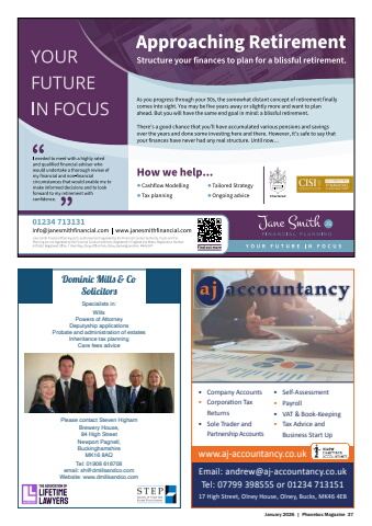 January 2026 | Phonebox Magazine 37%u2022 Company Accounts%u2022 Corporati on Tax Returns%u2022 Sole Trader and Partnership AccountsEmail: andrew@aj-accountancy.co.ukTel: 07799 398555 or 01234 71315117 High Street, Olney House, Olney, Bucks, MK46 4EB%u2022 Self-Assessment%u2022 Payroll%u2022 VAT & Book-Keeping%u2022 Tax Advice and Business Start Upwww.aj-accountancy.co.ukDominic Mills & CoSolicitorsSpecialists in:WillsPowers of AttorneyDeputyship applicationsProbate and administration of estatesInheritance tax planningCare fees advicePlease contact Steven HighamBrewery House, 84 High StreetNewport Pagnell, BuckinghamshireMK16 8AQTel: 01908 618708email: sh@dmillsandco.comWebsite: www.dmillsandco.com